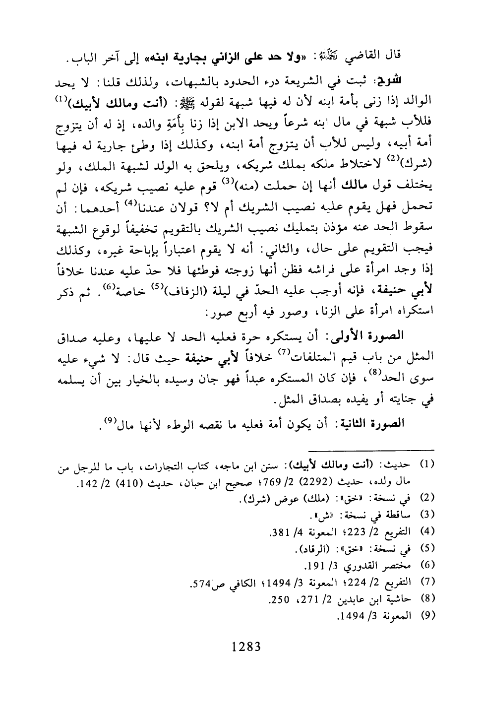 شرح: ثبت في الشريعة درء الحدود بالشبهات، ولذلك قلنا: لا يحد الوالد إذا زنى بأمة ابنه لأن له فيها شبهة لقوله -صلى الله عليه وسلم-: (أنت ومالك لأبيك) فللأب شبهة في مال ابنه شرعًا ويحد الابن إذا زنا بأمة والده، إذ له أن يتزوج أمه أبيه، وليس للأب أن يتزوج أمة ابنه، وكذلك إذا وطئ جارية له فيها (شرك) لاختلاط ملكه بملك شريكه، ويلحق به الولد لشبهة الملك، ولو يختلف قول مالك أنها إن حملت (منه) قوم عليه نصيب شريكه، فإن لم تحمل فهل يقوم عليه نصيب الشريك أم لا؟ قولان عندنا أحدهما: أن سقوط الحد عنه مؤذن بتمليك نصيب الشريك بالتقويم تخفيفًا لوقوع الشبهة فيجب التقويم على حال، والثاني: أنه لا يقوم اعتبارًا بإباحة غيره، وكذلك إذا وجد امرأة على فراشه فظن أنها زوجته فوطئها فلا حد عليه عندنا خلافًا لأبي حنيفة، فإنه أوجب عليه الحد في ليلة (الزفاف) خاصة. ثم ذكر استكراه امرأة على الزنا، وصور فيه أربع صور: