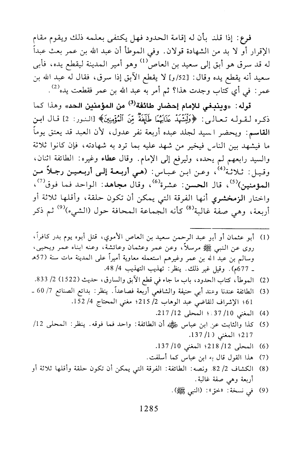 قوله: "وينبغي للإمام إحضار طائفة من المؤمنين الحد" وهذا كما ذكره لقوله تعالى: {وليشهد عذابهما طائفة من المؤمنين) قال ابن القاسم: ويحضر السيد لجلد عبده أربعة نفر عدول، لأن العبد قد يعتق يومًا ما فيشهد بين الناس فيخير من شهد عليه بما ترد به شهادته، فإن كانوا ثلاثة والسيد رابعهم لم يحده، وليرفع إلى الإمام. وقال عطاء وغيره: الطائفة اثنان، وقيل: ثلاثة، وعن ابن عباس: (هي أربعة إلى أربعين رجلًا من المؤمنين)، قال الحسن: عشرة، وقال مجاهد: الواحد فما فوق، واختار الزمخشري أنها الفرقة التي يمكن أن تكون حلقة، وأقلها ثلاثة أو أربعة، وهي صفة غالبة كأنه الجماعة المحافة حول (الشيء) ثم ذكر