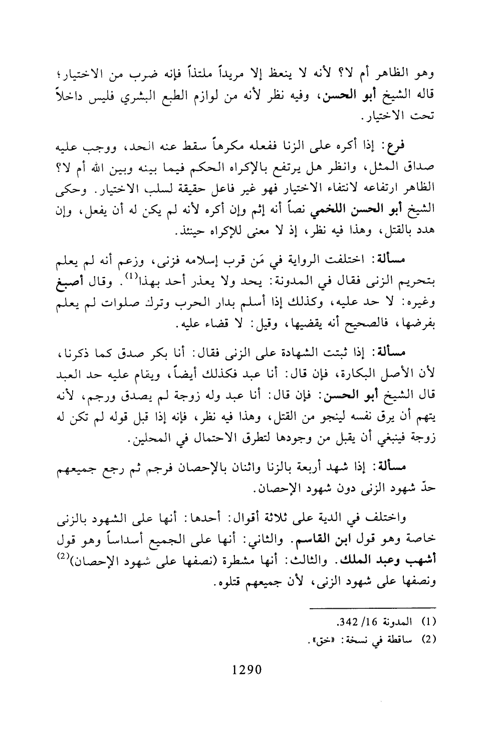 مسألة: اختلفت الرواية في مَن قرب إسلامه فزنى، وزعم أنه لم يعلم بتحريم الزنا فقال في «المدونة»: يحد ولا يعذر أحد بهذا. وقال أصبغ وغيره: لا حد عليه، وكذلك إذا أسلم بدار الحرب وترك صلوات لم يعلم بفرضها، فالصحيح أنه يقضيها، وقيل: لا قضاء عليه.