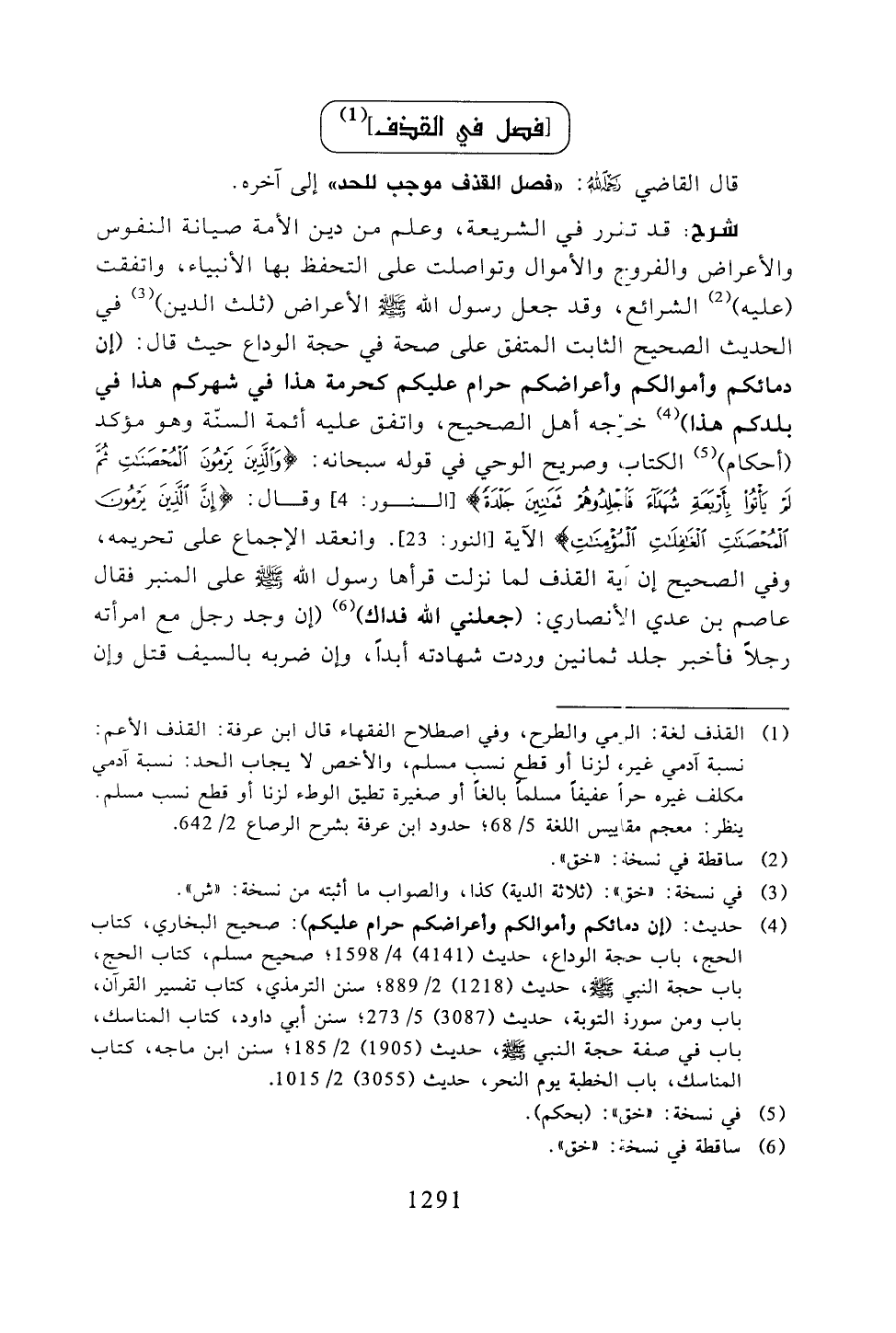 شرح: قد تقرر في الشريعة، وعلم من دين الأمة صيانة النفوس والأعراض والفروج والأموال وتواصلت على التحفظ بها الأنبياء، واتفقت (عليه) الشرائع، وقد جعل رسول الله -صلى الله عليه وسلم- الأعراض (ثلث الدين) في الحديث الصحيح الثابت المتفق على صحة في حجة الوداع حيث قال: (إن دمائكم وأموالكم وأعراضكم حرام عليكم كحرمة هذا في شهركم هذا في بلدكم هذا) خرجه أهل الصحيح، واتفق عليه أئمة السنة وهو مؤكد (أحكام) الكتاب وصريح الوحي في قوله سبحانه: {والذين يرمون المحصنات ثم لم يأتوا بأربعة شهداء فاجلدوهم ثمانين جلدة} الآية [النور: 4] وقال: {إن الذين يرمون المحصنات الغافلات المؤمنات} الآية [النور: 23]. وانعقد الإجماع على تحريمه، وفي الصحيح إن آية القذف لما نزلت قرأها رسول الله -صلى الله عليه وسلم- على المنبر فقال عاصم بن عدي الأنصاري: (جعلني الله فداك) (إن وجد رجل مع امرأته رجلًا فأخبر جلد ثمانين وردت شهادته أبدًا، وإن ضربه بالسيف قتل وإن