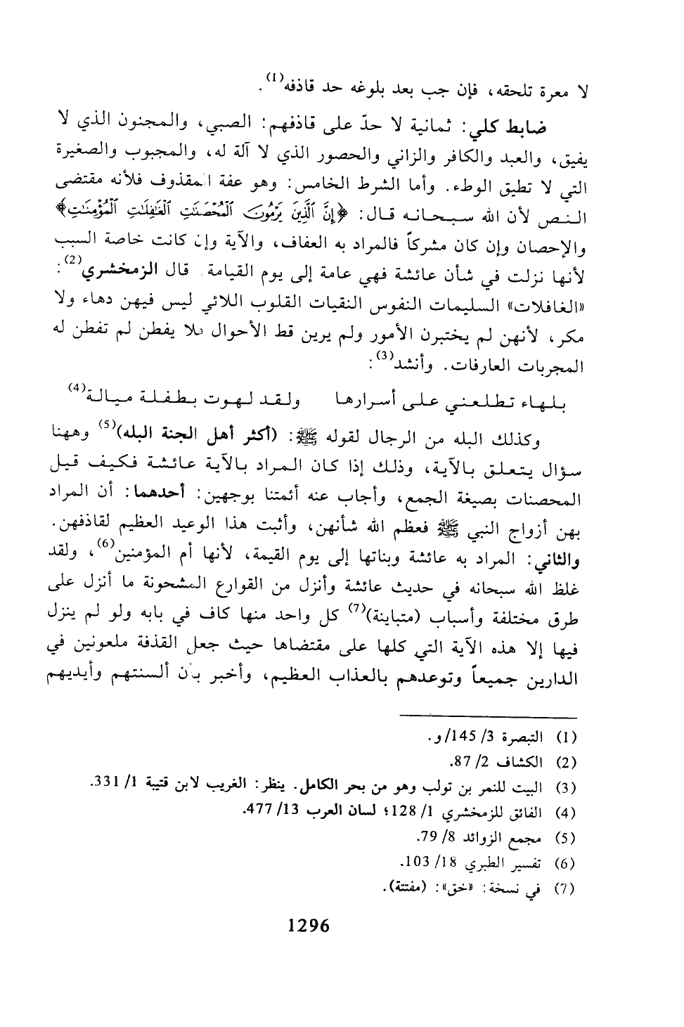 ضابط كلي: ثمانية لا حد على قاذفهم: الصبي، والمجنون الذي لا يفيق، والعبد والكافر والزاني والحصور الذي لا آلة له، والمجبوب والصغيرة التي لا تطيق الوطء. وأما الشرط الخامس: وهو عفة المقذوف فلأنه مقتضى النص لأن الله سبحانه قال: {إن الذين يرمون المحصنات الغافلات المؤمنات} والإحصان وإن كان مشركًا فالمراد به العفاف، والآية وإن كانت خاصة السبب لأنها نزلت في شأن عائشة فهي عامة إلى يوم القيامة. قال الزمخشري: "الغافلات" السليمات النفوس النقيات القلوب اللائي ليس فيهن دهاء ولا مكر، لأنهن لم يختبرن الأمور ولم يريد قط الأحوال فلا يفطن لم تفطن له المجربات العارفات. وأنشد: