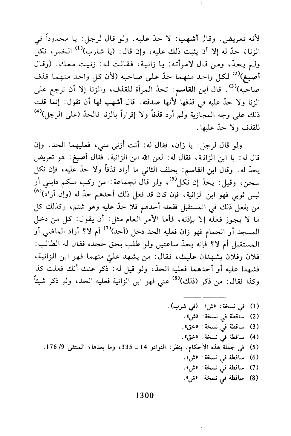 ولو قال لرجل: يا زان، فقال له: أنت أزنى مني، فعليهما الحد. وإن قال له: يا ابن الزانية، فقال له: لعن الله ابن الزانية. فقال أصبغ: هو تعريض يحد له. وقال ابن القاسم: يحلف الثاني ما أراد قذفًا ولا حد عليه، فإن نكل سحن، وقيل: يحد إن نكل، ولو قال لجماعة: من ركب منكم دابتي أو لبس ثوبي فهو ابن لزانية، فإن كان قد يفعل ذلك أحدهم حد له (وإن أراد) من يفعل ذلك في المستقبل ففعله أحدهم فلا حد عليه وهو شتم، وكذلك كل ما لا يجوز فعله إلا بإذنه، فأما الأمر العام مثل: أن يقول: كل من دخل المسجد أو الحمام فهو زان فعليه الحد دخل (أحد) أم لا؟ أراد الماضي أو المستقبل أم لا؟ فإنه يحد ساعتين ولو طلب بحق حجده فقال له الطالب: فلان وفلان يشهدان عليك، فقال: من يشهد علي منهما فهو ابن الزانية، فشهدوا عليه أو أحدهما فعليه الحد، ولو قيل له: ذكر عنك أنك فعلت كذا وكذا فقال: من ذكر (ذلك) عني فهو ابن الزانية فعليه الحد، ولو ذكر شيئًا
