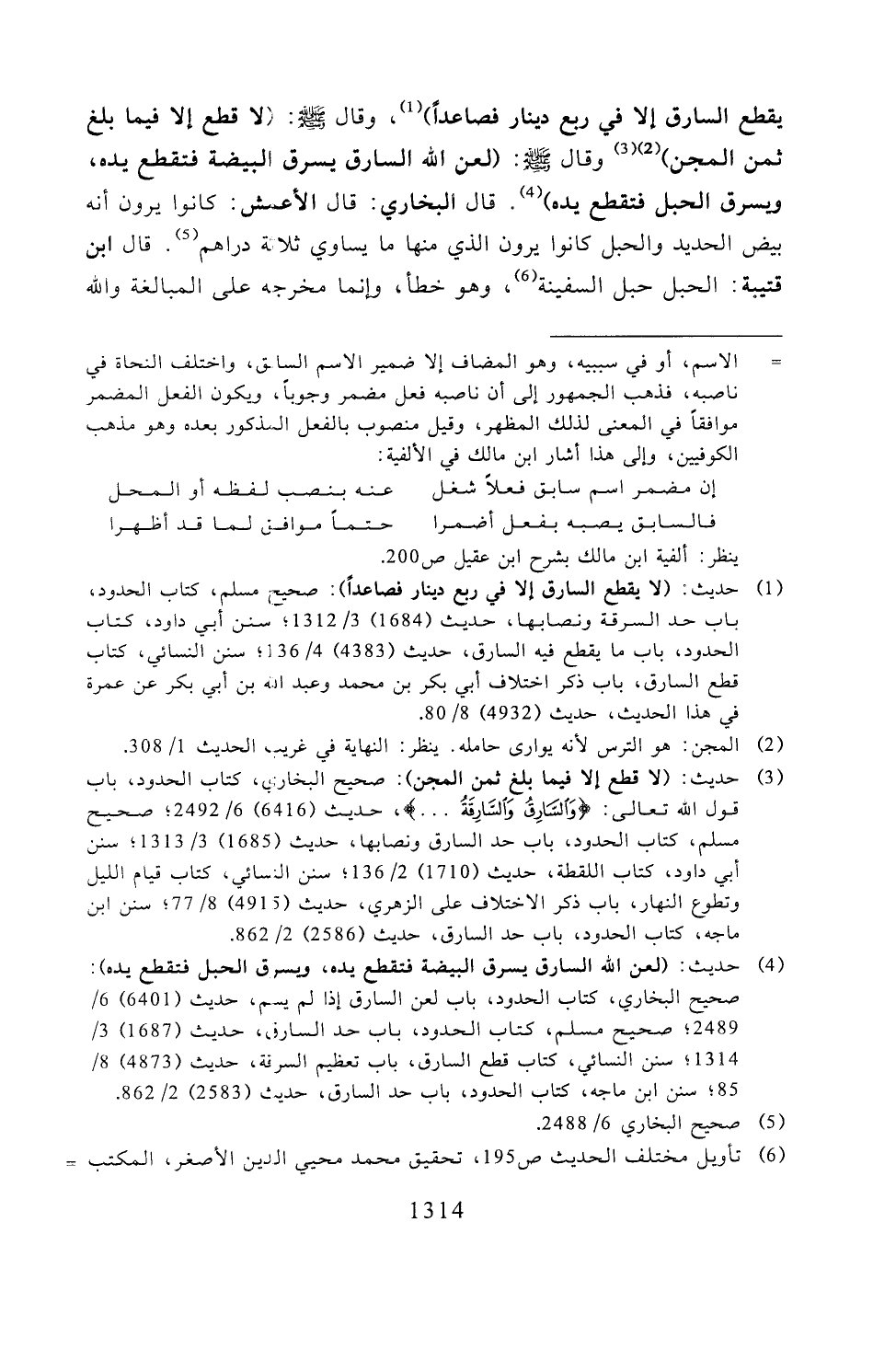 يقطع السارق إلا في ربع دينار فصاعدًا)، وقال -صلى الله عليه وسلم-: (لا قطع إلا فيما بلغ ثمن المجن) وقال -صلى الله عليه وسلم-: (لعن الله السارق يسرق البيضة فتقطع يده، ويسرق الحبل فتقطع يده). قال البخاري: قال الأعمش: كانوا يرون أنه بيض الحديد والحبل كانوا يرون الذي منها ما يساوي ثلاثة دراهم. قال ابن قتيبة: الحبل حبل السفينة، وهو خطأ، وإنما مخرجه على المبالغة والله