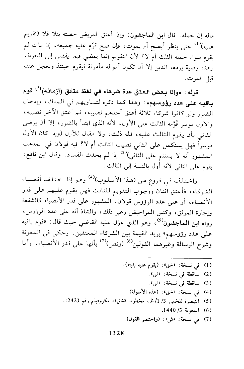 واختلف في فروع من (هذا الأسلوب) وهو إذا اختلف أنصباء الشركاء، فأعتق اثنان ووجوب التقويم للثالث فهل يقوم عليهم على قدر الأنصباء، أو على عدد الرؤوس قولان. المشهور على قدر الأنصباء كالشفعة وإجارة الموثق، وكنس المراحيض وغير ذلك، والشاذ أنه على عدد الرؤوس، رواه ابن الماجشون، وهو الذي عوّل عليه القاضي حيث قال: "قوم باقيه على عدد رؤوسهم" يريد القيمة بين الشركاء المعتقين. وحكى في المعونة وشرح الرسالة وغيرهما القولين (ونص) بأنها على قدر الأنصباء، وأما