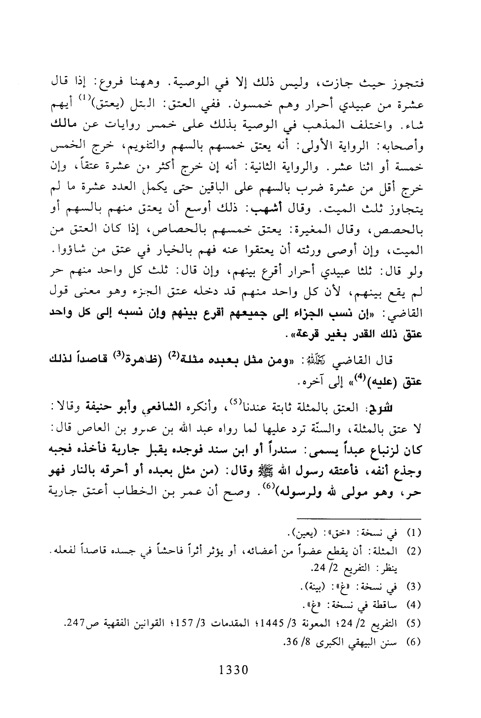 شرح: العتق بالمثلة ثابتة عندنا، وأنكره الشافعي وأبو حنيفة وقالا: لا عتق بالمثلة، والسنّة ترد عليها لما رواه عبد الله بن عمرو بن العاص قال: كان لزنباع عبدًا يسمى: سندرًا أو ابن سند فوجده يقبل جارية فأخذه فجبه وجذع أنفه، فأعتقه رسول الله - صلى الله عليه وسلم - وقال: 0 من مثل بعبده أو أحرقه بالنار فهو حر، وهو مولى لله ولرسوله). وصح أن عمر بن الخطاب أعتق جارية