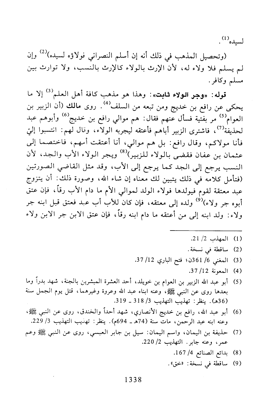 قوله: "وجر الولاء ثابت": وهذا هو مذهب كافة أهل العلم إلا ما يحكى عن رافع بن خديج ومن تبعه من السلف. روى مالك (أن الزبير بن العوام مر بفتية فسأل عنهم فقال: هم موالي رافع بن خديج وأبوهم عبد لحذيفة، فاشترى الزبير أباهم فأعتقه ليجربه الولاء، وقال لهم: انتسبوا إليّ فأنا مولاكم، وقال رافع: بل هم موالي، أنا أعتقت أمهم، فاختصما إلى عثمان بن عفان فقضى بالولاء للزبير (ويجر الولاء الأب والجد، لأن النسب يرجع إلى الجد كما يرجع إلى الأب، وقد مثل القاضي الصورتين (فتأمل كلامه في ذلك يتبين لك معناه إن شاء الله، وصورة ذلك: أن يتزوج عبد معتقة لقوم فيولدها فولاء الولد لموالي الأم ما دام الأب رقًا، فإن عتق أبوه جر ولاء) ولده إلى معتقه، فإن كان للأب أب عبد فعتق قبل ابنه جر ولاء: ولد ابنه إلى من أعتقه ما دام ابنه رقًا، فإن عتق الابن جر الابن ولاء