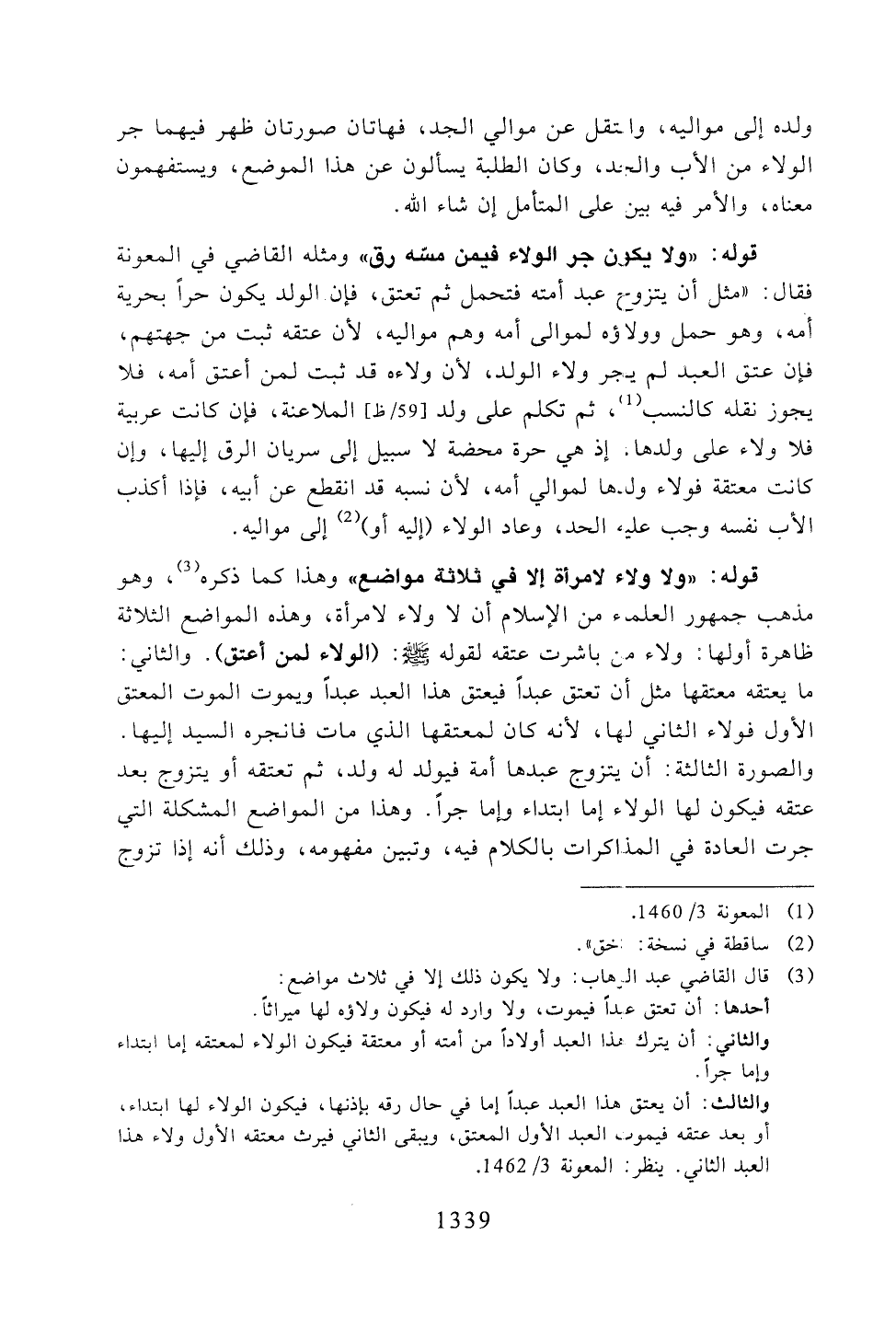 قوله: "ولا ولاء لا مرأة إلا في ثلاثة مواضع" وهذا كما ذكره، وهو مذهب جمهور العلماء من الإسلام أن لا ولاء لا مرأة، وهذه المواضع الثلاثة ظاهرة أولها: ولاء من باشرت عتقه لقوله - صلى الله عليه وسلم -: (الولاء لمن أعتق). والثاني: ما يعتقه معتقها مثل أن تعتق عبدًا فيعتق هذا العبد عبدًا ويموت الموت المعتق الأول فولاء الثاني لها، لأنه كان لمعتقها الذي مات فانجره السيد إليها. والصورة الثالثة: أن يتزوج عبدها أمة فيولد له ولد، ثم تعتقه أو يتزوج بعد عتقه فيكون لها الولاء إما ابتداء وإما جرًا. وهذا من المواضع المشكلة التي جرت العادة في المذكرات بالكلام فيه، وتبين مفهومه، وذلك أنه إذا تزوج