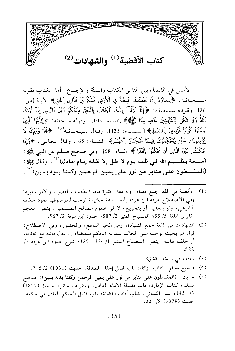 الأصل في القضاء بين الناس الكتاب والسنّة والإجماع. أما الكتاب فقوله سبحانه: {يداود إنا جعلناك خليفة في الأرض فأحكم بين الناس بالحق} الآية [ص: 26] وقوله سبحانه: {إنا أنزلنا إليك الكتاب بالحق لتحكم بين الناس بما أراك الله ولا تكن للخائنين خصيما} [النساء: 105]. وقوله سبحانه: {يأيها الذين ءامنوا كونوا قوامين بالقسط} [النساء: 135]. وقال سبحانه: {فلا وربك لا يؤمنون حتى يحكموك فيما شجر بينهم} [النساء: 65]. وقال تعالى: {وإذا حكمتم بين الناس أن تحكموا بالعدل} [النساء: 58]. وفي صحيح مسلم عن النبي - صلى الله عليه وسلم -: (سبعة يظلهم الله في ظله يوم لا ظل إلا ظله إمام عادل). وقال - صلى الله عليه وسلم -: (المقسطون على منابر من نور على يمين الرحمن وكلتا يديه يمين).