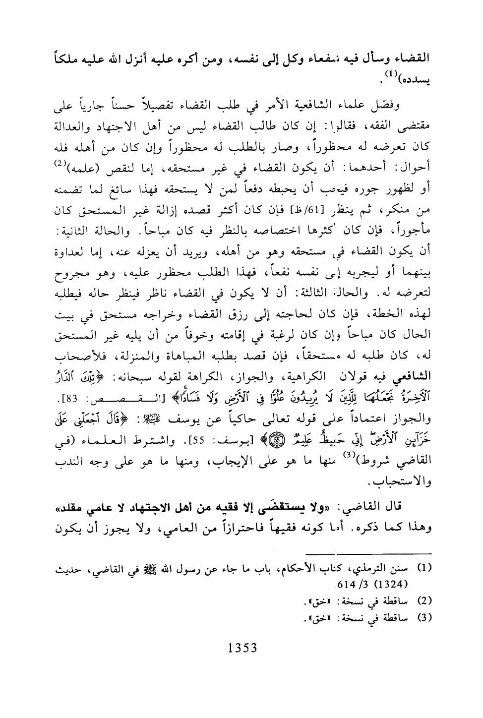 وفصّل علماء الشافعية الأمر في طلب القضاء تفصيلاً حسنًا جاريًا على مقتضى الفقه، فقالوا: إن كان طالب القضاء ليس من أهل الاجتهاد والعدالة كان تعرضه له محظورًا، وصار بالطلب له محظورًا وإن كان من أهله فله أحوال: أحدهما: أن يكون القضاء في غير مستحقه، إما لنقص (علمه) أو لظهور جوره فيجب أن يحبطه دفعًا لمن لا يستحقه فهذا سائغ لما تضمنه من منكر، ثم ينظر فإن كان أكثر قصده إزالة غير المستحق كان مأجورًا، فإن كان أكثرها اختصاصه بالنظر فيه كان مباحًا. والحالة الثانية: أن يكون القضاء في مستحقه وهو من أهله، ويريد أن يعزله عنه، إما لعداوة بينهما أو ليجربه إلى نفسه نفعًا، فهذا الطلب محظور عليه، وهو مجروح لتعرضه له. والحالة الثالثة: أن لا يكون في القضاء ناظر فينظر حاله فيطلبه لهذه الخطة، فإن كان لحاجته إلى رزق القضاء وخراجه مستحق في بيت الحال كان مباحًا وإن كان لرغبة في إقامته وخوفًا من أن يليه غير المستحق له، كان طلبه له مستحقًا، فإن قصد بطلبه المباهاة والمنزلة، فلأصحاب الشافعي فيه قولان الكراهية، والجواز، الكراهة لقوله سبحانه: {تلك الدار الآخرة نجعلها للذين لا يريدون علو في الأرض ولا فسادًا} [القصص: 83]. والجواز اعتمادًا على قوله تعالى حاكيًا عن يوسف - عليه السلام -: {قال اجعلني على خزائن الأرض إني حفيظ عليم} [يوسف: 55]. واشترط العلماء (في القاضي شروط) منها ما هو على الإيجاب، ومنها ما هو على وجه الندب والاستحباب.
