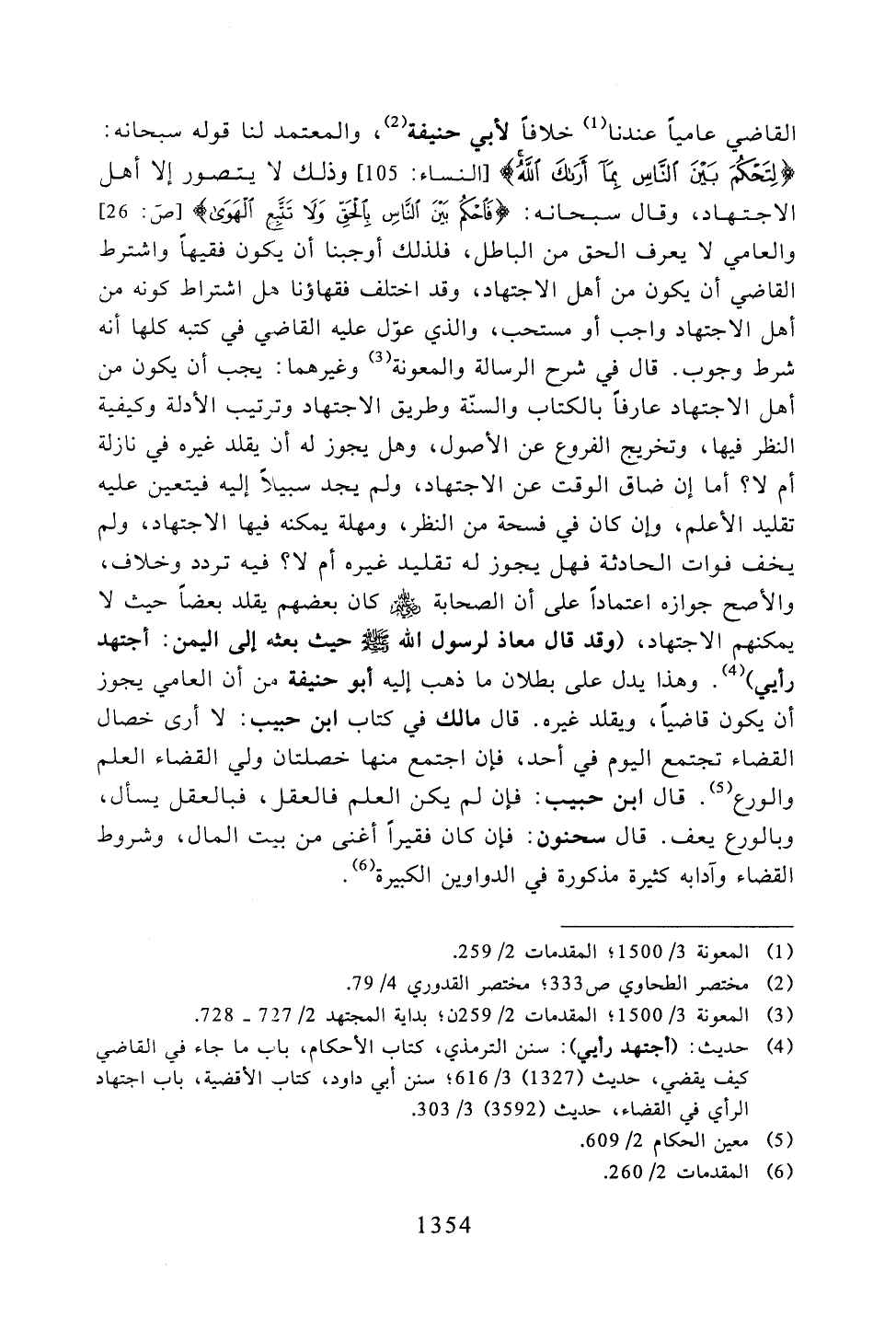القاضي عاميًا عندنا خلافًا لأبي حنيفة، والمعتمد لنا قوله سبحانه: {لتحكم بين الناس بما أراك الله} [النساء: 105] وذلك لا يتصور إلا أهل الاجتهاد، وقال سبحانه: {فاحكم بين الناس بالحق ولا تتبع الهوى} [ص: 26] والعامي لا يعرف الحق من الباطل، فلذلك أوجبنا أن يكون فقيهًا واشترط القاضي أن يكون من أهل الاجتهاد، وقد اختلف فقهاؤنا هل اشتراط كونه من أهل الاجتهاد واجب أو مستحب، والذي عوّل عليه القاضي في كتبه كلها أنه شرط وجوب. قال في شرح الرسالة والمعونة وغيرهما: يجب أن يكون من أهل الاجتهاد عارفًا بالكتاب والسنّة وطريق الاجتهاد وترتيب الأدلة وكيفية النظر فيها، وتخريج الفروع عن الأصول، وهل يجوز له أن يقلد غيره في نازلة أم لا؟ أما إن ضاق الوقت عن الاجتهاد، ولم يجد سبيلاً إليه فيتعين عليه تقليد الأعلم، وإن كان في فسحة من النظر، ومهلة يمكنه فيها الاجتهاد، ولم يخف فوات الحادثة فهل يجوز له تقليد غيره أم لا؟ فيه تردد وخلاف، والأصح جوازه اعتمادًا على أن الصحابة - رضي الله عنهم - كان بعضهم يقلد بعضًا حيث لا يمكنهم الاجتهاد، (وقد قال معاذ لرسول الله - صلى الله عليه وسلم - حيث بعثه إلى اليمن: أجتهد رأيي). وهذا يدل على بطلان ما ذهب إليه أبو حنيفة من أن العامي يجوز أن يكون قاضيًا، ويقلد غيره. قال مالك في كتاب ابن حبيب: لا أرى خصال القضاء تجتمع اليوم في أحد، فإن اجتمع منها خصلتان ولي القضاء العلم والورع. قال ابن حبيب: فإن لم يكن العلم فالعقل، فبالعقل يسأل، وبالورع يعف. قال سحنون: فإن كان فقيرًا أغنى من بيت المال، وشروط القضاء وآدابه كثيرة مذكورة في الدواوين الكبيرة.