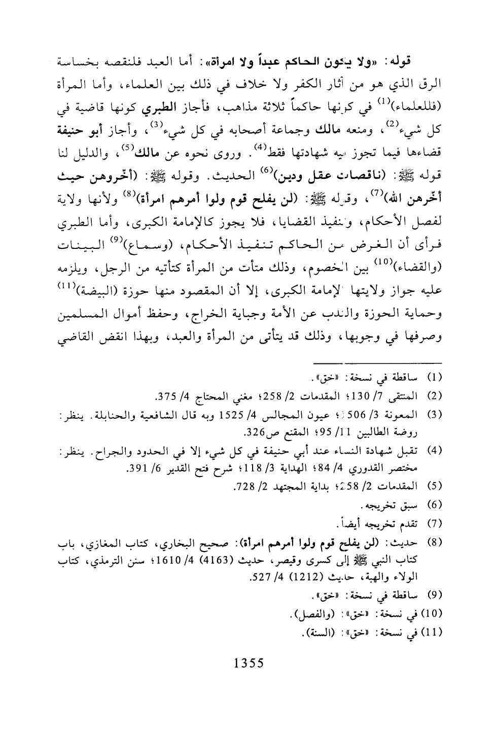 قوله: "ولا يكون الحاكم عبدًا ولا امرأة": أما العبد فلنقصه بخساسة الرق الذي هو من آثار الكفر ولا خلاف في ذلك بين العلماء، وأما المرأة (فللعلماء في كونها حاكمًا ثلاثة مذاهب، فأجاز الطبري كونها قاضية في كل شيء، ومنعه مالك وجماعة أصحابه في كل شيء، وأجاز أبو حنيفة قضاءها فيما تجاوز فيه شهادتها فقط. وروى نحوه عن مالك، الدليل لنا قوله -صلى الله عليه وسلم-: (ناقصات عقل ودين) الحديث. وقوله -صلى الله عليه وسلم-: (أخروهن حيث أخرهن الله)، وقوله -صلى الله عليه وسلم-: (لن يفلح قوم ولوا أمرهم امرأة) ولأنها ولاية لفصل الأحكام، وتنفيذ القضايا، فلا يجوز كالإمامة الكبرى، وأما الطبري فرأى أن الغرض من الحاكم تنفيذ الأحكام، (وسماع) البيانات (والقضاء) بين الخصوم، وذلك متأت من المرأة كتأتيه من الرجل، ويلزمه عليه جواز ولايتها الإمامة الكبرى، إلا أن المقصود منها حوزة (البيضة) وحماية الحوزة والندب عن الأمة وجباية الخراج، وحفظ أموال المسلمين وصرفها في وجوبها، وذلك قد يتأتى من المرأة والعبد، وبهذا انقض القاضي