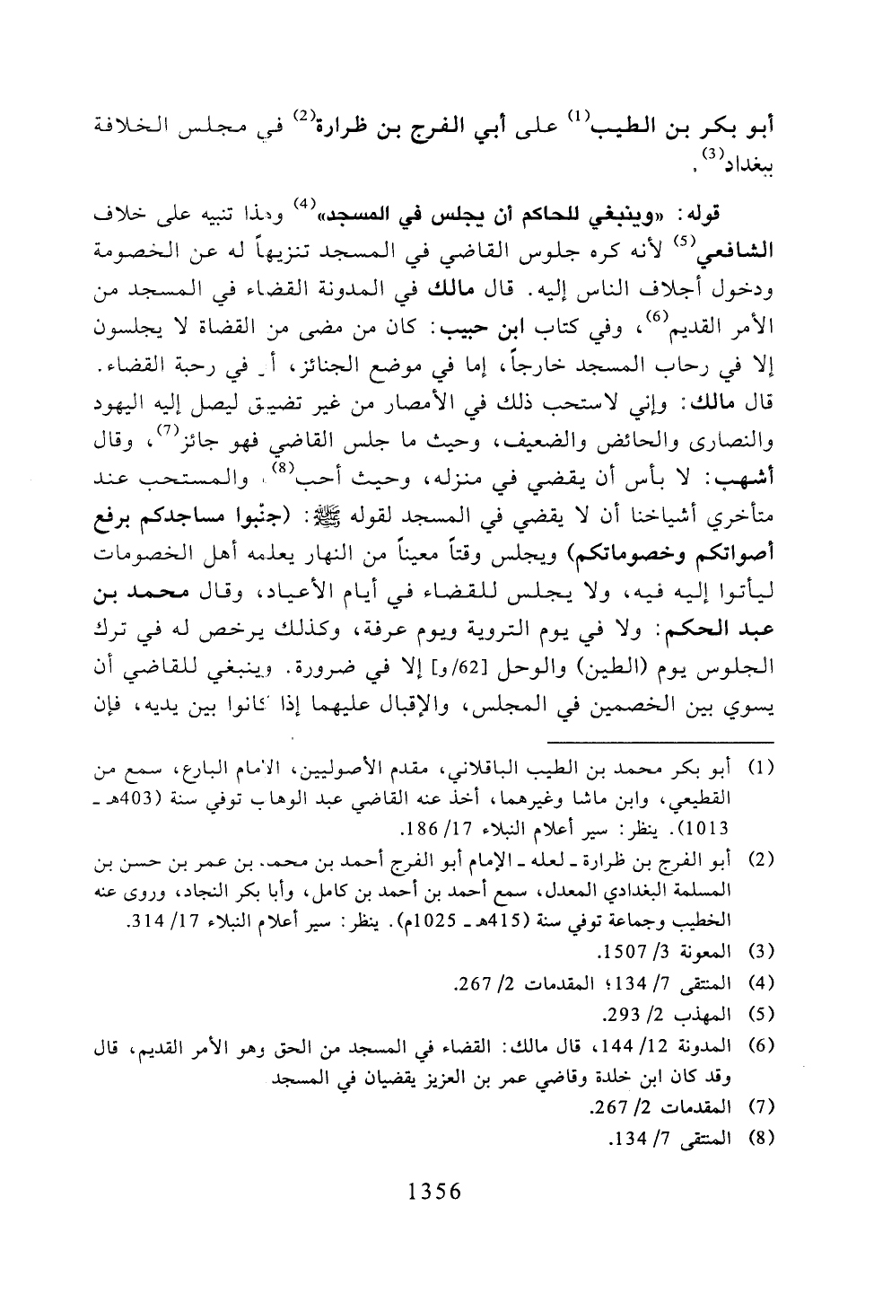 قوله: "وينبغي للحاكم أن يجلس في المسجد" وهذا تنبيه على خلاف الشافعي لأنه كره جلوس القاضي في المسجد تنزيهًا له عن الخصومة ودخول أجلاف الناس إليه. قال مالك في المدونة القضاء في المسجد من الأمر القديم، وفي كتاب ابن حبيب: كان قد مضى من القضاة لا يجلسون إلا في رحاب المسجد خارجًا، إما في موضع الجنائز، أو في رحبة القضاء. قال مالك: وإني لاستحب ذلك في الأمصار من غير تضييق ليصل إليه اليهود والنصارى والحائض والضعيف، وحيث ما جلس القاضي فهو جائز، وقال أشهب: لا بأس أن يقضي في منزله، وحيث أحب والمستحب عند متأخري أشياخنا أن لا يقضي في المسجد لقوله -صلى الله عليه وسلم-: (جنبوا مساجدكم برفع أصواتكم وخصوماتكم) ويجلس وقتًا معينًا من النهار يعلمه أهل الخصومات ليأتوا إليه فيه، ولا يجلس للقضاء في أيام الأعياء، وقال محمد بن عبد الحكم: ولا في يوم التروية ويوم عرفة، وكذلك يرخص له في ترك الجلوس يوم (الطين) والوحل إلا في ضرورة. وينبغي للقاضي أن يسوي بين الخصمين في المجلس، والإقبال عليهما إذا كانوا بين يديه، فإن