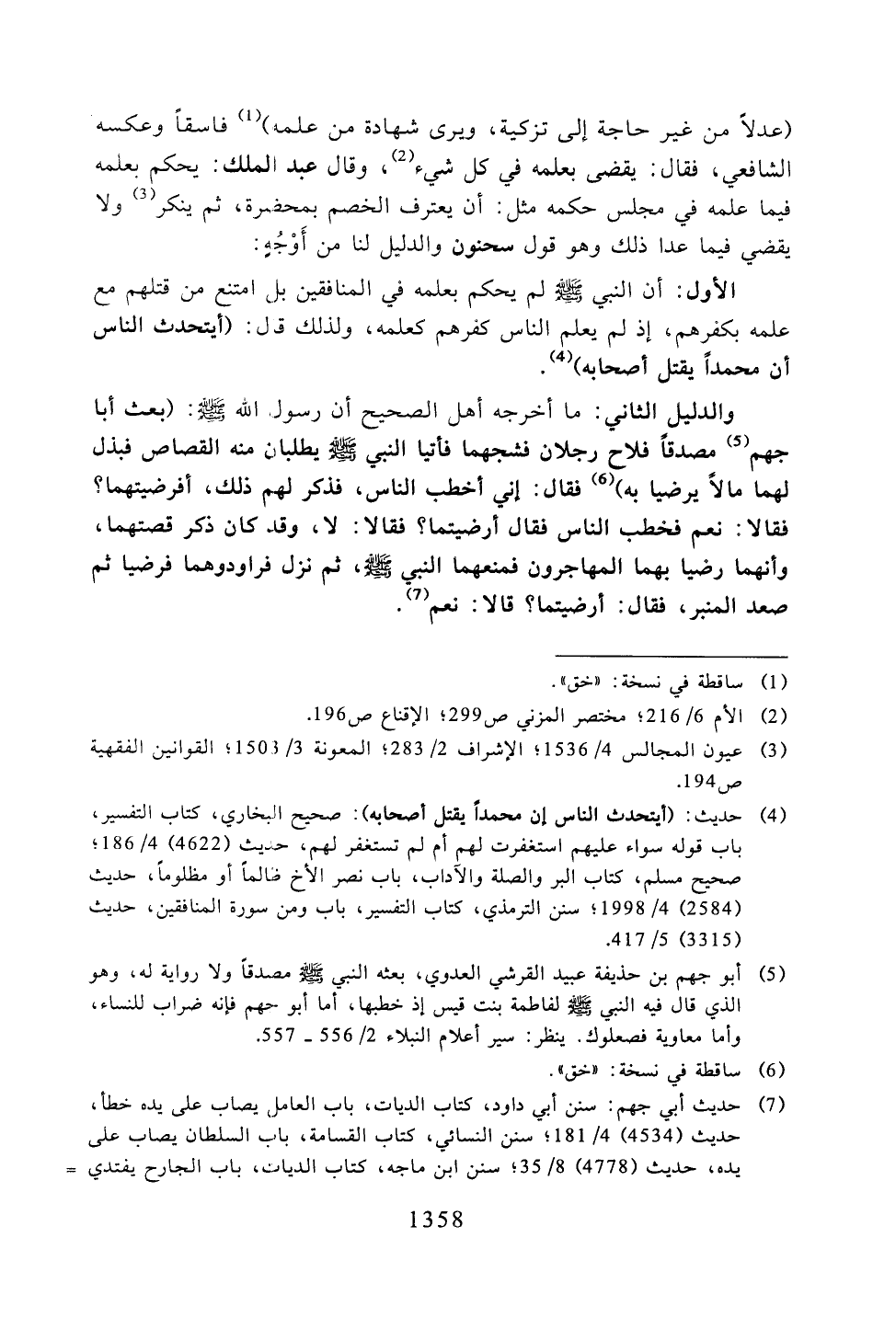الأول: أن النبي -صلى الله عليه وسلم- لم يحكم بعلمه في المنافقين بل امتنع من قتلهم مع علمه بكفرهم، إذ لم يعلم الناس كفرهم كعلمه، ولذلك قال: (أيتحدث الناس أن محمدًا يقتل أصحابه).