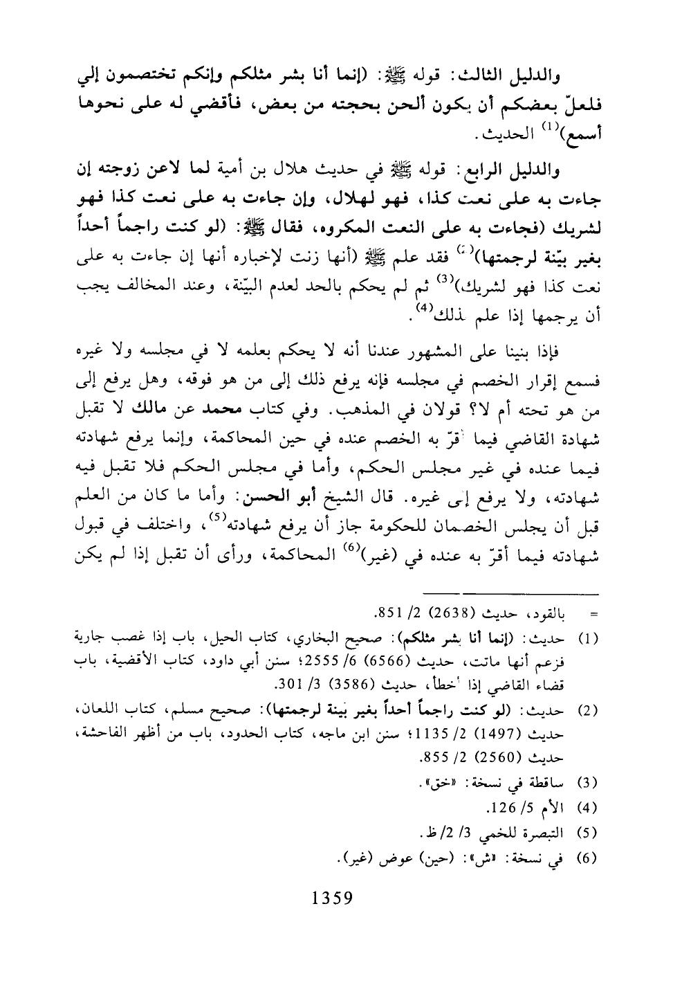 والدليل الثالث: قوله -صلى الله عليه وسلم-: (إنما أنا بشر مثلكم وإنكم تختصمون إلى فلعل بعضكم أن يكون ألحن بحجته من بعض، فأقضي له على نحوها أسمع) الحديث.