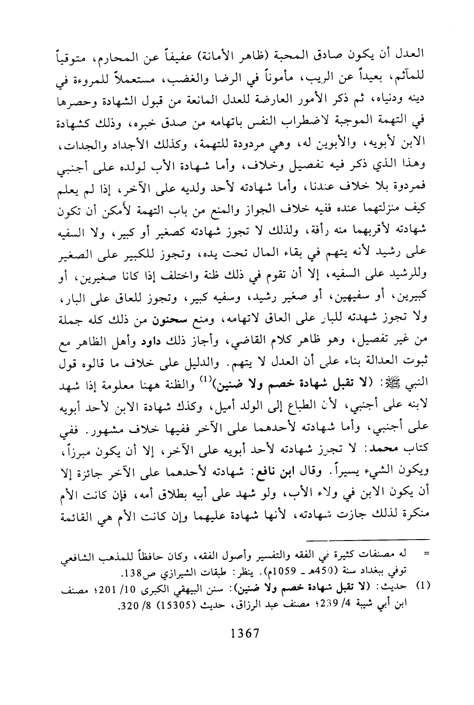 العدل أن يكون صادق المحبة (ظاهر الأمانة) عفيفًا عن المحارم، متوقيًا للمآثم، بعيدًا عن الريب، مأمونًا في الرضا والغضب، مستعملاً للمروءة في دينه ودنياه، ثم ذكر الأمور العارضة للعدل المانعة من قبول الشهادة وحصرها في التهمة الموجبة لاضطراب النفس باتهامه من صدق خبره، وذلك كشهادة الابن لأبويه، والأبوين له، وهي مردودة للتهمة، وكذلك الأجداد والجدات، وهذا الذي ذكر فيه تفصيل وخلاف، وأما شهادة الأب لولده على أجنبي فمردودة بلا خلاف عندنا، وأما شهادته لأحد ولديه على الآخر، إذا لم يعلم كيف منزلتهما عنده ففيه خلاف الجواز والمنع من باب التهمة لأمكن أن تكون شهادته لأقربهما منه رأفة، ولذلك لا تجوز شهادته كصغير أو كبير، ولا السفيه على رشيد لأنه يتهم في بقاء المال تحت يده، وتجوز للكبير على الصغير وللرشيد على السفيه، إلا أن تقوم في ذلك ظنة واختلف إذا كانا صغيرين، أو كبيرين، أو سفيهين، أو صغير رشيد، وسفيه كبير، وتجوز للعاق على البار، ولا تجوز شهادته للبار على العاق لاتهامه، ومنع سحنون من ذلك كله جملة من غير تفصيل، وهو ظاهر كلام القاضي، وأجاز ذلك داود وأهل الظاهر مع ثبوت العدالة بناء على أن العدل لا يتهم. والدليل على خلاف ما قالوه قول النبي -صلى الله عليه وسلم-: (لا تقبل شهادة خصم ولا ضنين) والظنة ههنا معلومة إذا شهد لابنه على أجنبي، وأما شهادته لأحدهما على الآخر ففيها خلاف مشهور. ففي كتاب محمد: لا تجوم شهادته لأحد أبويه على الآخر، إلا أن يكون مبرزًا، ويكون الشيء يسيرًا. وقال ابن نافع: شهادته لأحدهما على الآخر جائزة إلا أن يكون الابن في ولاء الأب، ولو شهد على أبيه بطلاق أمه، فإن كانت الأم منكرة لذلك جازت شهادته، لأنها شهادة عليهما وإن كانت الأم هي القائمة
