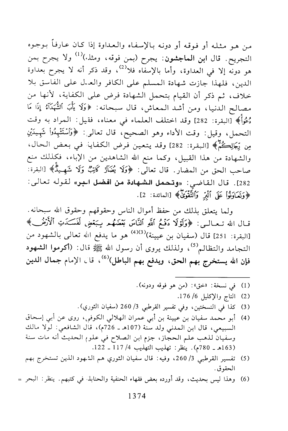 ولما يتعلق بذلك من حفظ أموال الناس وحقوقهم وحقوق الله سبحانه. قال الله تعالى: {ولولا دفع الله الناس بعضهم ببعضٍ لفسدت الأرض} [البقرة: 251] قال (سفيان بن عيينة) هو ما يدفع الله تعالى بالشهود من التجامد والتظالم، ولذلك يروى أن رسول الله -صلى الله عليه وسلم- قال: (أكرموا الشهود فإن الله يستخرج بهم الحق، ويدفع بهم الباطل)، قال الإمام جمال الدين