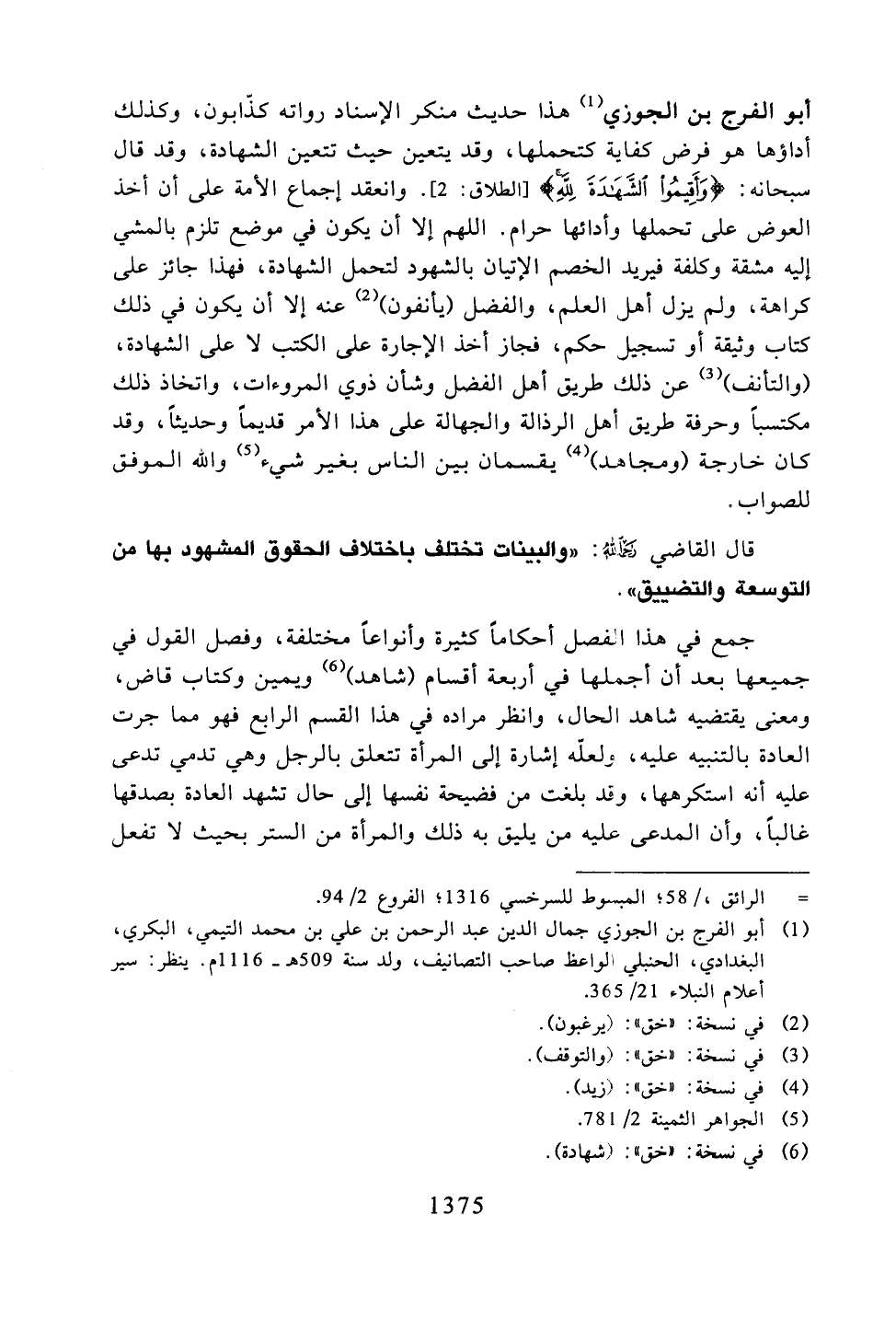 قال القاضي -رحمه الله-: "والبينات تختلف باختلاف الحقوق المشهود بها من التوسعة والتضييق".
