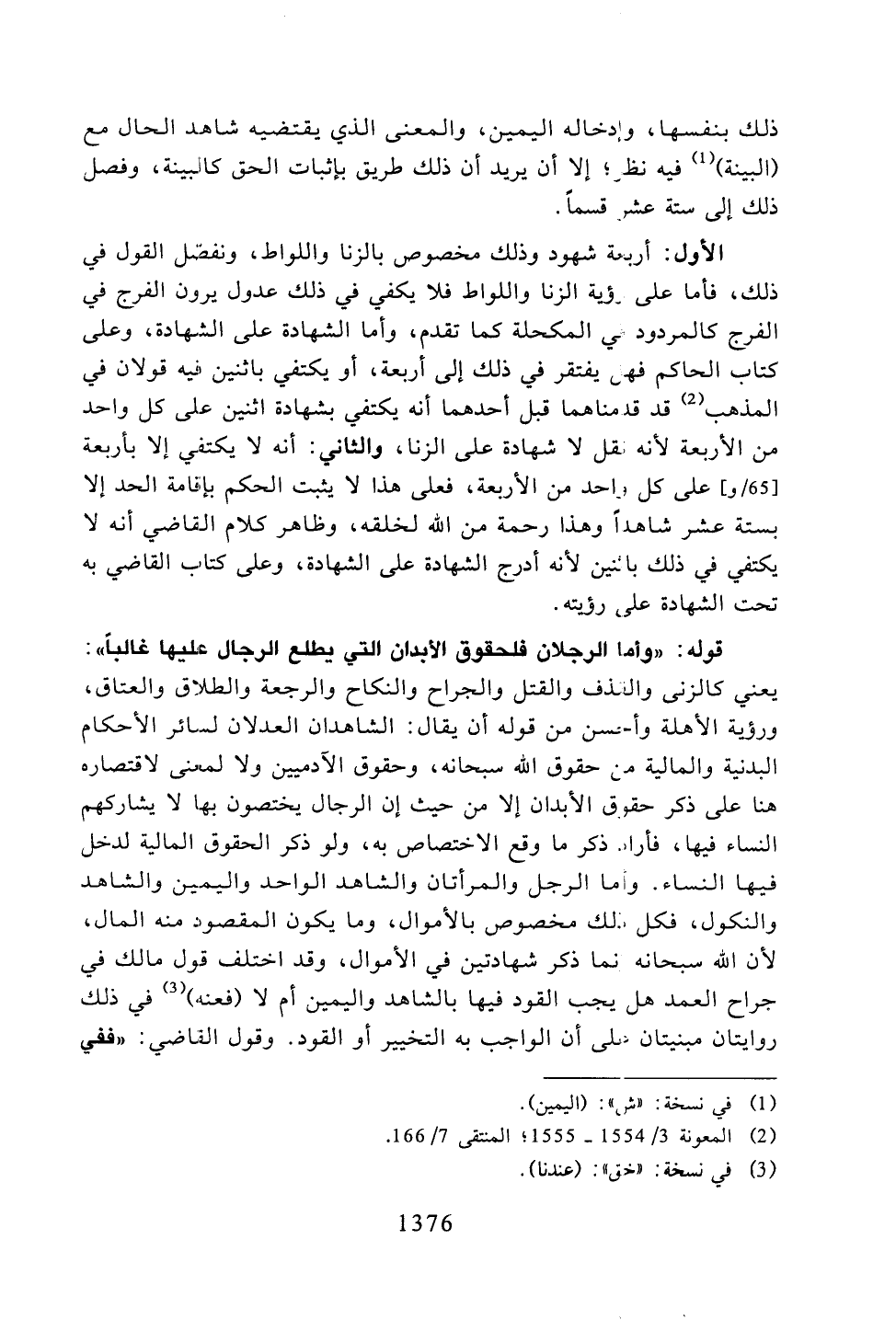قوله: "وأما الرجلان فلحقوق الأبدان التي يطلع الرجال عليها غالبًا": يعني كالزنى والقذف والقتل والجراح والنكاح والرجعة والطلاق والعتاق، ورؤية الأهلة وأحسن من قوله أن يقال: الشاهدان العدلان لسائر الأحكام البدنية والمالية من حقوق الله سبحانه، وحقوق الآدميين ولا لمعنى لاقتصاره هنا على ذكر حقوق الأبدان إلا من حيث إن الرجال يختصون بها لا يشاركهم النساء فيها، فأراد ذكر ما وقع الاختصاص به، ولو ذكر الحقوق المالية لدخل فيها النساء. وأما الرجل والمرأتان والشاهد الواحد واليمين والشاهد والنكول، فكل ذلك مخصوص بالأموال، وما يكون المقصود منه المال، لأن الله سبحانه إنما ذكر شهادتين في الأموال، وقد اختلف قول مالك في جراح العمد هل يجب القود فيها بالشاهد واليمين أم لا (فعنه) في ذلك روايتان مبنيتان على أن الواجب به التخيير أو القود. وقول القاضي: "ففي