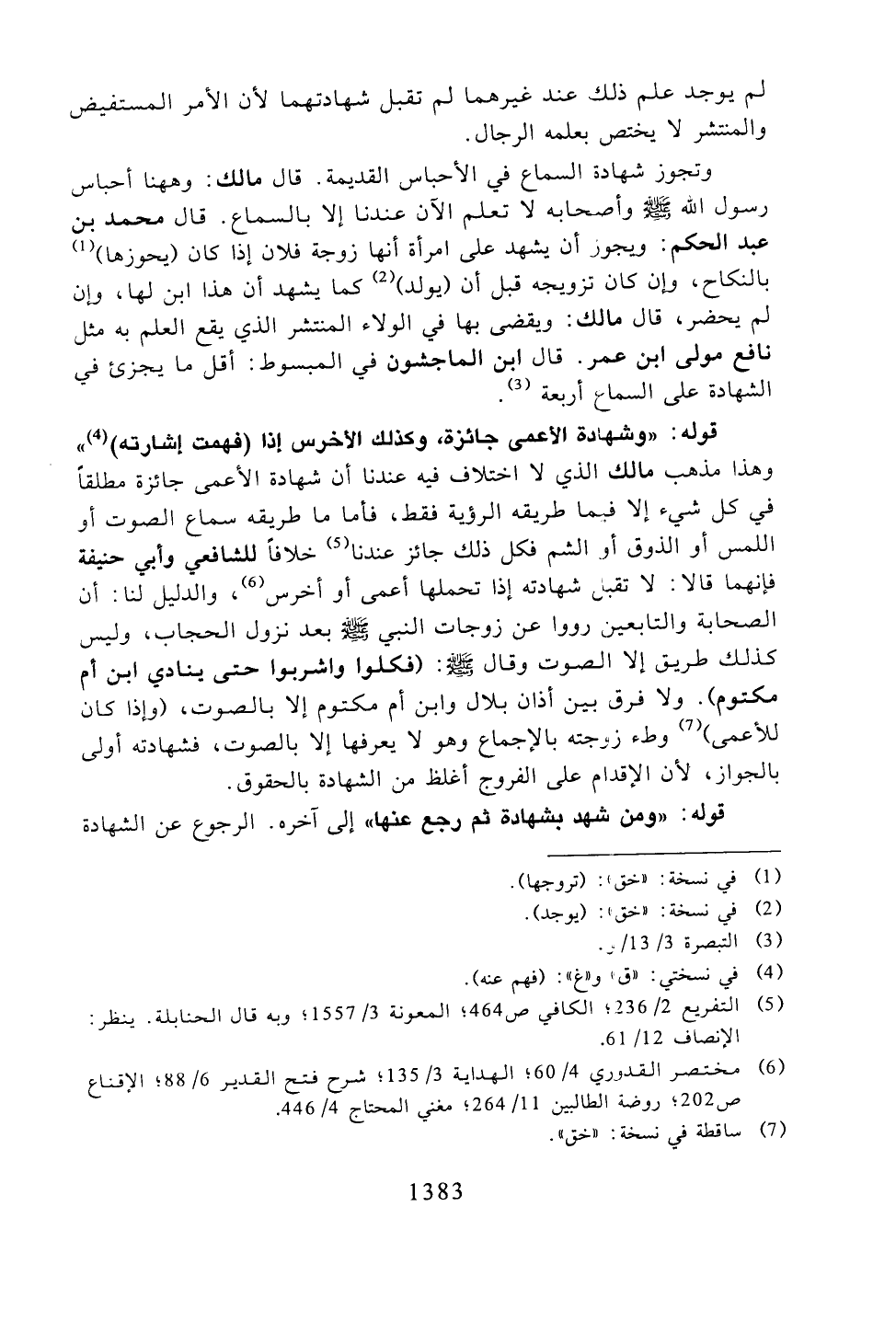 قوله: "وشهادة الأعمى جائزة، وكذلك الأخرس إذا (فهمت إشارته) " وهذا مذهب مالك الذي لا اختلاف فيه عندنا أن شهادة الأعمى جائزة مطلقًا في كل شيء إلا فيما طريقه الرؤية فقط، فأما ما طريقه سماع الصوت أو اللمس أو الذوق أو الشم فكل ذلك جائز عندنا خلافًا للشافعي وأبي حنيفة فإنهما قالا: لا تقبل شهادته إذا تحملها أعمى أو أخرس، والدليل لنا: أن الصحابة والتابعين رووا عن زوجات النبي -صلى الله عليه وسلم- بعد نزول الحجاب، وليس كذلك طريق إلى الصوت وقال -صلى الله عليه وسلم-: (فكلوا واشبوا حتى ينادي ابن أم مكتوم). ولا فرق بين أذان بلال وابن أم مكتوم إلا بالصوت، (وإذا كان للأعمى) وطء زوجته بالإجماع وهو لا يعرفها إلا بالصوت، فشهادته أولى بالجواز، لأن الإقدام على الفروج أغلظ من الشهادة بالحق.