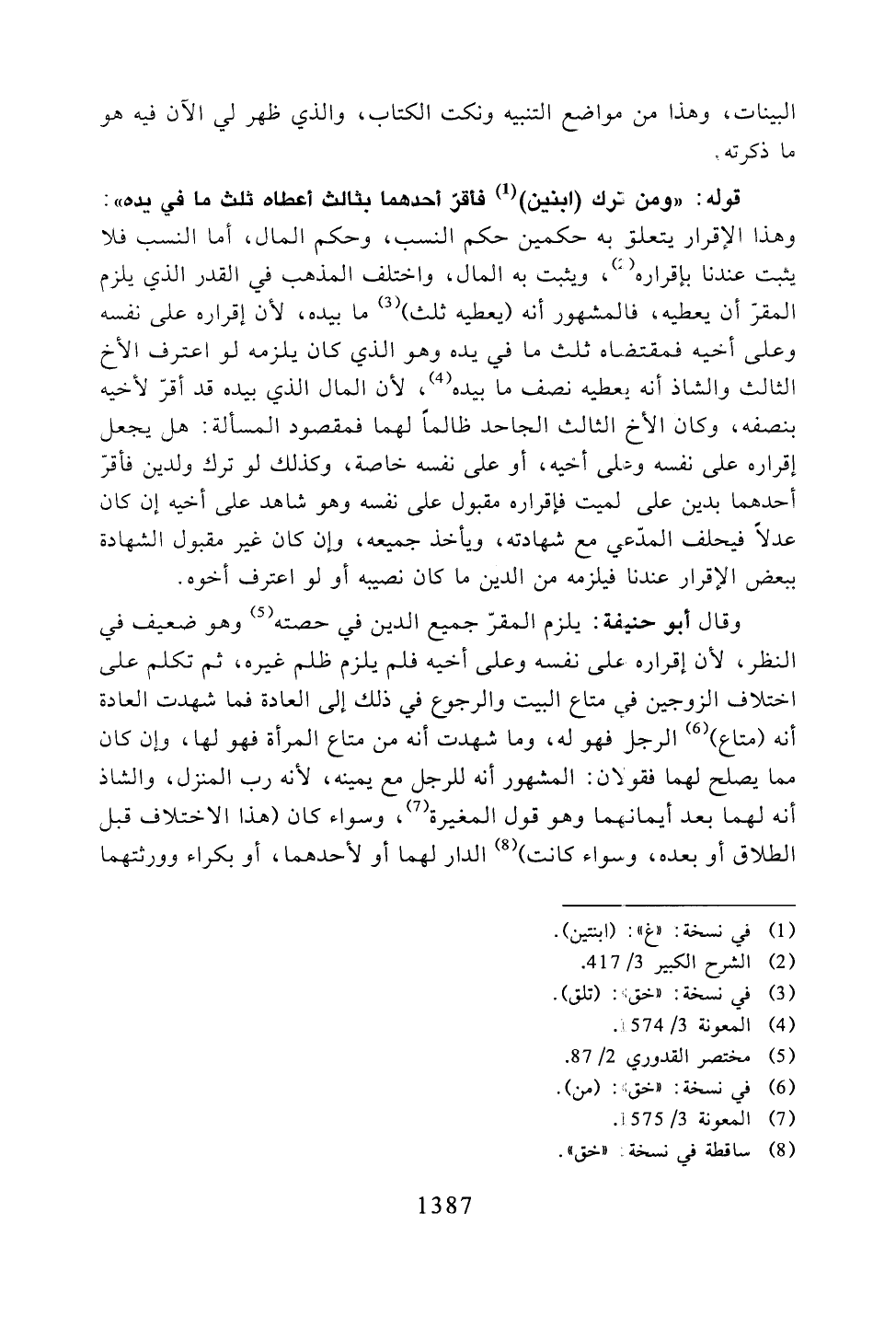 وقال أبو حنيفة: يلزم المقر جميع الدين في حصته وهو ضعيف في النظر، لأن إقراره على نفسه وعلى أخيه فلم يلزم ظلم غيره، ثم تكلم على اختلاف الزوجين في متاع البيت والرجوع في ذلك إلى العادة فما شهدت العادة أنه (متاع) الرجل فهو له، وما شهدت أنه من متاع المرأة فهو لها، وإن كان مما يصلح لهما فقولان: المشهور أنه للرجل مع يمينه، لأنه رب المنزل، والشاذ أنه لهما بعد إيمانهما وهو قول المغيرة، وسواء كان (هذا الاختلاف قبل الطلاق أو بعده، وسواء كانت) الدار لهما أو لأحدهما، أو بكراء وورثتهما