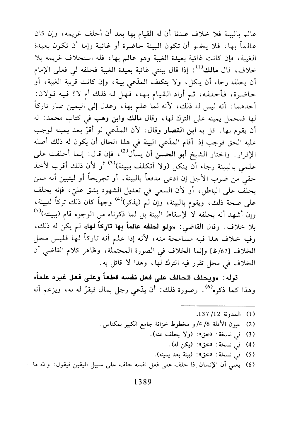عالم بالبينة فلا خلاف عندنا أن له القيام بها بعد أن أحلف غريمه، وإن كان عالمًا بها، فلا يخلوا أن تكون البينة حاضرة أو غائبة وإما أن تكون بعيدة الغيبة، فإن كانت غائبة بعيدة الغيبة وهو عالم بها، فله استحلاف غريمه بلا خلاف، قال مالك: إذا قال بينتي غائبة بعيدة الغيبة لحلفه لي فعلى الإمام أن يحلفه رجاء أن ينكل، ثم أراد القيام بها، فهل له ذلك أم لا؟ فيه قولان: أحدهما: أنه ليس له ذلك، لأنه لما علم بها، وعدل إلى اليمين صار تاركًا لها فمحمل يمينه على الترك لها، وقال مالك وابن وهب في كتاب محمد: له أن يقوم بها. قل به ابن القصار وقال: لأن المدعي لو أقر بعد يمينه لوجب عليه الحق فوجب إذ أقام المدعي البينة في هذا الحال أن يكون له ذلك أصله الإقرار. واختار الشيخ أبو الحسن أن يسأل، فإن قال: إنما أحلف على علمي بالبينة رجاء أن ينكل (ولا أتكلف ببينة) أو لأن ذلك أقرب لأخذ حقي من ضرب الأجل إن ادعى مدفعًا بالبينة، أو تجريحًا أو ليتبين أنه ممن يحلف على الباطل، أو لأن السعي في تعديل الشهود يشق علي، فإنه يحلف على صحة ذلك، ويقوم بالبينة، وإن لم (يذكر) وجهًا كان ذلك تركًا للبينة، وإن أشهد أنه يحلفه لا لإسقاط البينة بل لما ذكرناه من الوجوه قام (ببينته) بلا خلاف. وقال القاضي: "ولو أحلفه عالمًا بها تاركًا لها" لم يكن له ذلك، وفيه خلاف هذا فيه مسامحة منه، لأنه إذا علم أنه تاركًا لها فليس محل الخلاف وإنما الخلاف في الصورة المحتملة، وظاهر كلام القاضي أن الخلاف في محل تقرر فيه الترك لها، وهذا لا قائل به.