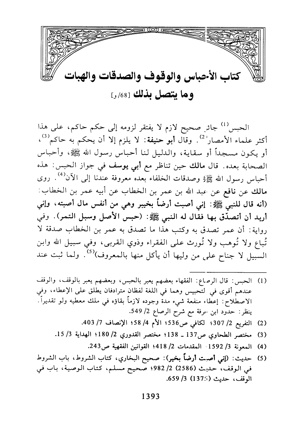 الحبس جائز صحيح لازم لا يفتقر لزومه إلى حكم حاكم، على هذا أكثر علماء الأمصار. وقال أبو حنيفة: لا يلزم إلا أن يحكم به حاكم، أو يكون مسجدًا أو سقاية، والدليل لنا أحباس رسول الله -صلى الله عليه وسلم-، وأحباس الصحابة بعده. قال مالك حين تناظر مع أبي يوسف في جواز الحبس: هذه أحباس رسول الله -صلى الله عليه وسلم- وصدقات الخلفاء بعده معروفة عندنا إلى الآن. روى مالك عن نافع عن عبد الله بن عمر بن الخطاب عن أبيه عمر بن الخطاب: (أنه قال للنبي -صلى الله عليه وسلم-: إني أصبت أرضًا بخيبر وهي من أنفس مال أصبته، وإني أريد أن أتصدق بها فقال له النبي -صلى الله عليه وسلم-: (حبس الأصل وسبل التمر). وفي رواية: أن عمر تصدق به وكتب هذا ما تصدق به عمر بن الخطاب صدقة لا تباع ولا توهب ولا تورث على الفقراء وذوي القربى، وفي سبيل الله وابن السبيل لا جناح على من وليها أن يأكل منها بالمعروف). ولما ثبت عند