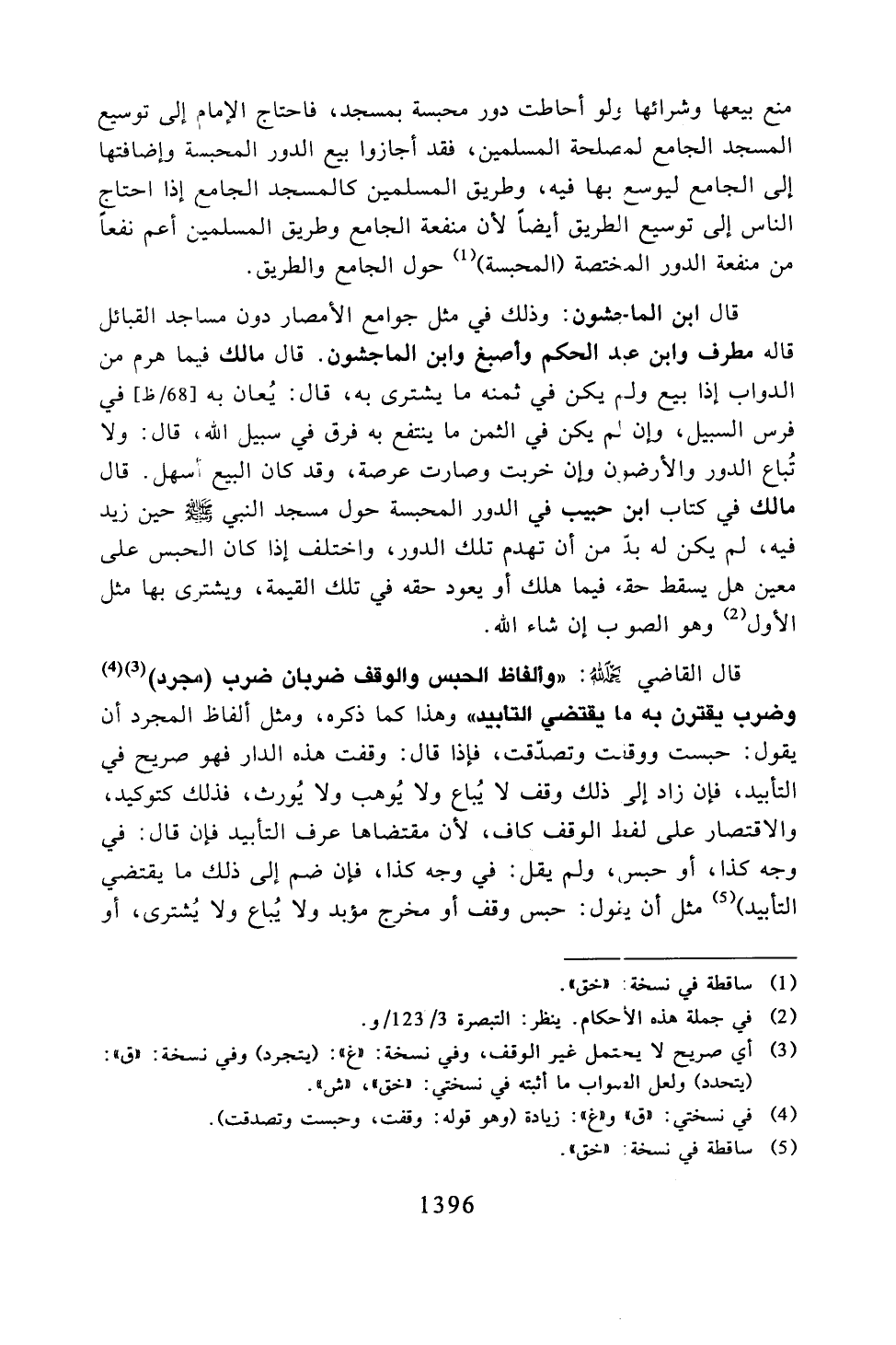 قال ابن الماجشون: وذلك في مثل جوامع الأمصار دون مساجد القبائل قاله مطرف وابن عبد الحكم وأصبغ وابن الماجشون. قال مالك فيما هرم من الدواب إذا بيع ولم يكن في ثمنه ما يشترى به، قال: يعان به في فرس السبيل، وإن لم يكن في الثمن ما ينتفع به فرق في سبيل الله، قال: ولا تباع الدور والأرضون وإن خربت وصارت عرصة، وقد كان البيع أسهل. قال مالك في كتاب ابن حبيب في الدور المحبسة حول مسجد النبي -صلى الله عليه وسلم- حين زيد فيه، لم يكن له بد من أن تهدم تلك الدور، واختلف إذا كان الحبس على معين هل يسقط حقه فيما هلك أو يعود حقه في تلك القمة، ويشترى بها مثل الأول وهو الصواب إن شاء الله.