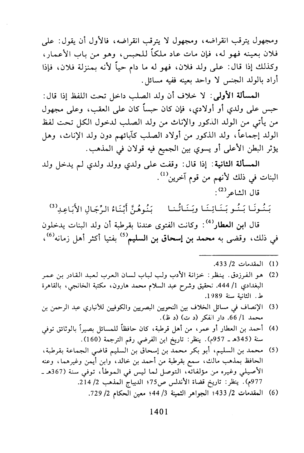 قال ابن العطار: وكانت الفتوى عندنا بقرطبة أن ولد البنات يدخلون في ذلك، وقضى به محمد بن إسحاق بن السليم، بفتيا أكثر أهل زمانه،