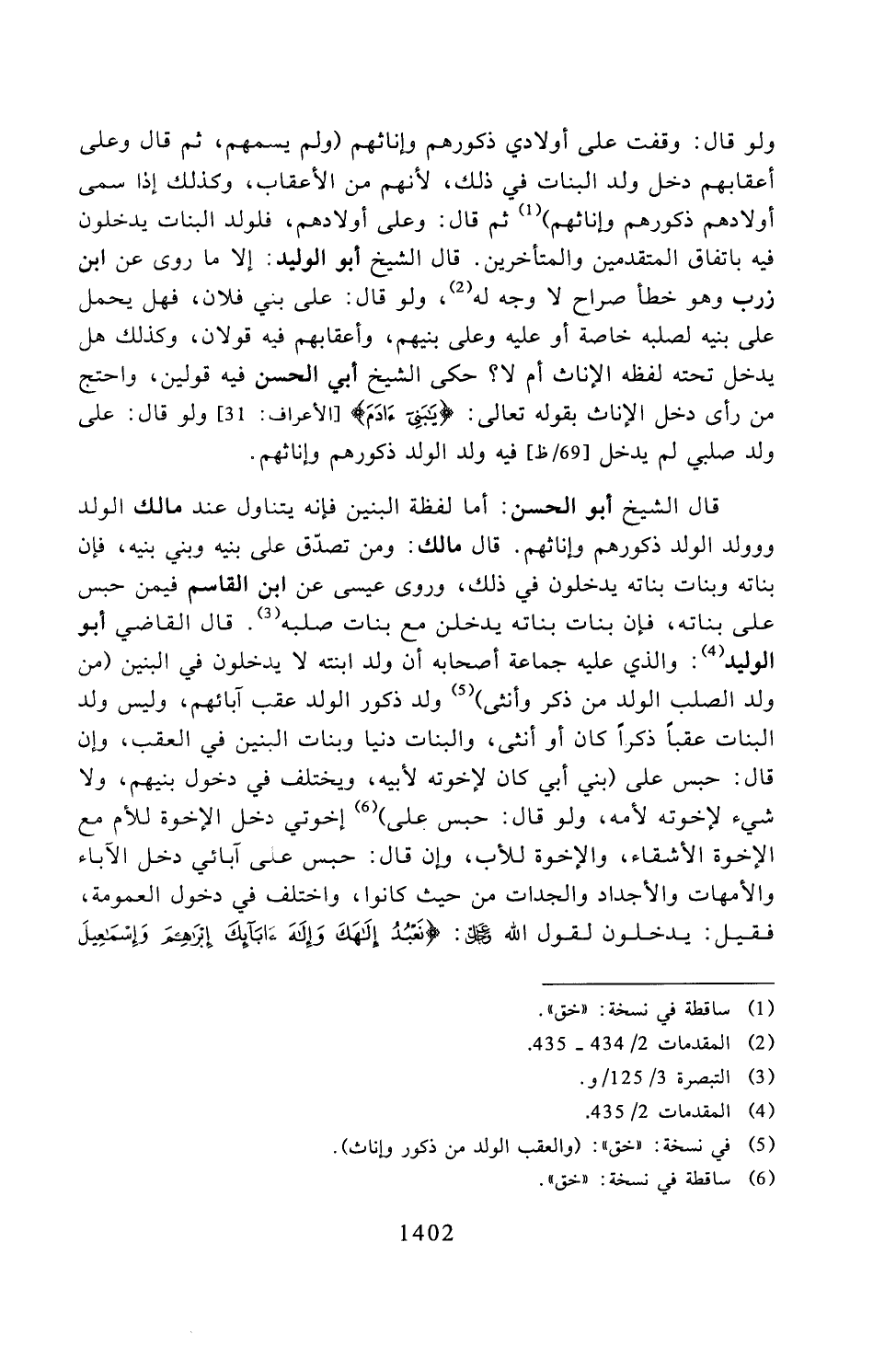 ولو قال: وقفت على أولادي ذكورهم وإناثهم (ولم يسمهم، ثم قال وعلى أعقابهم دخل ولد البنات في ذلك، لأنهم في الأعقاب، وكذلك إذا سمى أولادهم ذكورهم وإناثهم) ثم قال: وعلى أولادهم، فولد البنات يدخلون فيه باتفاق المتقدمين والمتأخرين. قال الشيخ أبو الوليد: إلا ما روي عن ابن زرب وهو خطأ صراح لا وجه له، ولو قال: على بني فلان، فهل يحمل على بنيه لصلبه خاصة أو عليه وعلى بنيهم، وأعقابهم فيه قولان، وكذلك هل يدخل تحته لفظه الإناث أم لا؟ حكى الشيخ أبي الحسن فيه قولين، واحتج من رأى دخل الإناث بقوله تعالى: {يبني آدم} [الأعراف: 31] ولو قال: على ولد صلبي لم يدخل فيه ولد الولد ذكورهم وإناثهم.