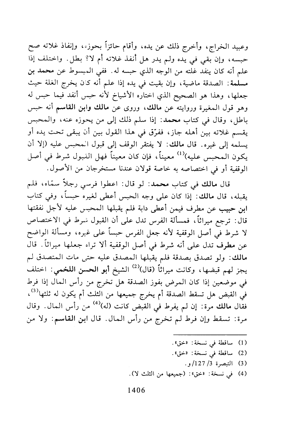 وعبيد الخراج، وأخرج ذلك عن يده، وأقام حائزًا بحوزه، وإنفاذ غلاته صح حبسه، وإن بقي في يده ولم يدر هل أنفذ غلاته أم لا؟ بطل. واختلف إذا علم أنه كان ينفد غلته من الوجه الذي حبسه له. ففي المبسوط عن محمد بن مسلمة: الصدقة ماضية، وإن بقيت في يده إذا علم أنه كان يخرج الغلة حيث جعلها، وهذا هو الصحيح الذي اختاره الأشياخ لأنه حبس أنفد فيما حبس له وهو قول المغيرة وروايته عن مالك، وروى عن مالك وابن القاسم أنه حبس باطل، وقال في كتاب محمد: إذا سلم ذلك إلى من يحوزه عنه، والمحبس يقسم غلاته بين أهله جاز، ففرق في هذا القول بين أن يبقى تحت يده أو يسلمه إلى غيره. قال مالك: لا يفتقر الوقف إلى قبول المحبس عليه (إلا أن يكون المحبس عليه) معينًا، فإن كان معينًا فهل القبول شرط في أصل الوقفية أو في اختصاصه به خاصة قولان عندنا مستخرجان من الأصول.