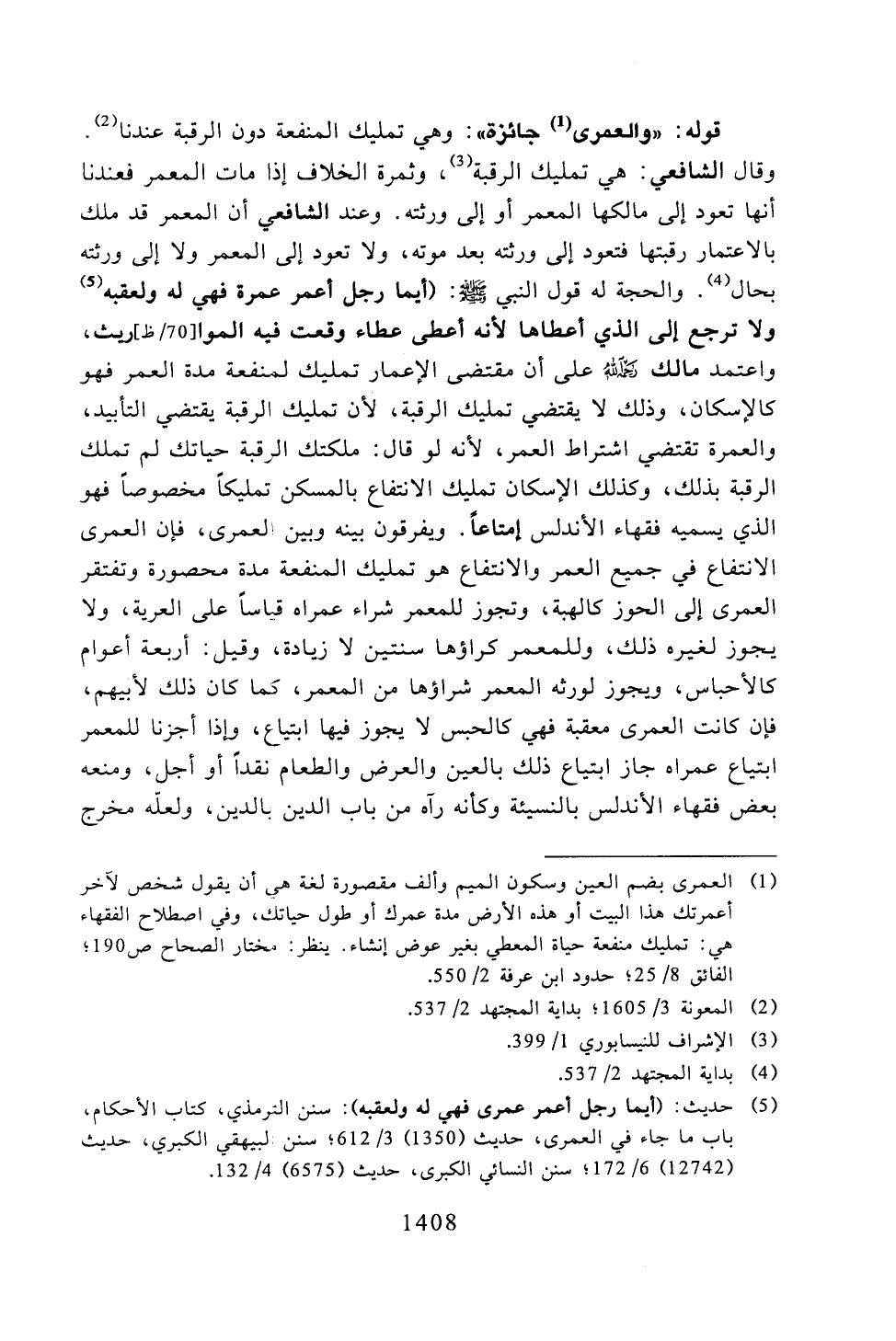 قوله: "والعمرى جائزة": وهي تمليك المنفعة دون الرقبة عندنا. وقال الشافعي: هي تمليك الرقبة، وثمرة الخلاف إذا مات المعمر فعندنا أنها تعود إلى مالكها المعمر أو إلى ورثته. وعند الشافعي أن المعمر قد ملك بالاعتمار رقبتها فتعود إلى ورثته بعد موته، ولا تعود إلى المعمر ولا إلى ورثته بحال. والحجة له قول النبي -صلى الله عليه وسلم-: (أيما رجل أعمر عمرة فهي له ولعقبه ولا ترجع إلى الذي أعطاها لأنه أعطى عطاء وقعت فيه المواريث، واعتمد مالك -رحمه الله- على أن مقتضى الإعمار تمليك لمنفعة مدة العمر فهو كالإسكان، وذلك لا يقتضي تمليك الرقبة، لأن تمليك الرقبة يقتضي التأبيد، والعمرة تقتضي اشتراط العمر، لأنه لو قال: ملكتك الرقبة حياتك لم تملك الرقبة بذلك، وكذلك الإسكان تمليك الانتفاع بالمسكن تمليكًا مخصوصًا فهو الذي يسميه فقهاء الأندلس إمتاعًا. ويفرقون بينه وبين العمري، فإن العمري الانتفاع في جمع العمر والانتفاع هو تمليك المنفعة مدة محصورة وتفتقر العمري إلى الحوز كالهبة، وتجوز للمعمر شراء عمراه قياسًا على العرية، ولا يجوز لغيره ذلك، وللمعمر كراؤها سنتين لا زيادة، وقيل: أربعة أعوام كالأحباس، ويجوز لورثه المعمر شراؤها من المعمر، كما كان ذلك لأبيهم، فإن كانت العمرى معقبة فهي كالحبس لا يجوز فيها ابتياع، وإذا أجزنا للمعمر ابتياع عمراه جاز ابتياع ذلك بالعين والعرض والطعام نقدًا أو أجل، ومنعه بعض فقهاء الأندلس بالنسيئة وكأنه رآه من باب الدين بالدين، ولعله مخرج