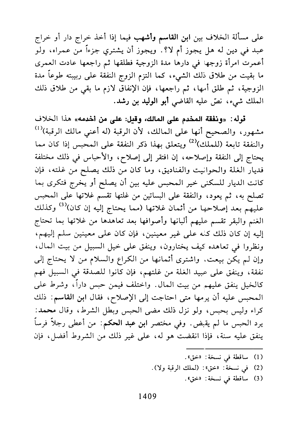 قوله: "ونفقة المخدم على المالك، وقيل: على من أخدمه" هذا الخلاف مشهور، والصحيح أنها على المالك، لأن الرقبة (له أعني مالك الرقبة) والنفقة تابعة (للملك) ويتعلق بهذا ذكر النفقة على المحبس إذا كان مما يحتاج إلى النفقة وإصلاحه، إن افتقر إلى إصلاح، والأحباس في ذلك مختلفة فديار الغلة والحوانيت والفناديق، وما كان من ذلك يصلح أو يخرج فتكرى بما تصلح به، ثم يعود، والنفقة على البساتين من غلتها تقسم غلاتها على المحبس عليهم بعد إصلاحها من أثمان غلاتها (مما يحتاج إليه إن كان) وكذلك الغنم والبقر تقسم عليهم ألبانها وأصوافها بعد تعاهدها من غلاتها بما تحتاج إليه إن كان ذلك كله على غير معينين، فإن كان على معينين سلم إليهم، ونظروا في تعاهده كيف يختارون، وينفق على خيل السبيل من بيت المال، وإن لم يكن بيعت، واشترى أثمانها من الكراع والسلام من لا يحتاج إلى نفقة، وينفق على عبيد الغلة من غلتهم، فإن كانوا للصدقة في السبيل فهم كالخيل ينفق عليهم من بيت المال. واختف فيمن حبس دارًا، وشرط على المحبس عليه أن يرمها متى احتاجت إلى الإصلاح، فقال ابن القاسم: ذلك كراء وليس بحبس، ولو نزل ذلك مضى الحبس وبطل الشرط، وقال محمد: يرد الحبس ما لم يقبض. وفي مختصر ابن عبد الحكم: من أعطى رجلاً فرسًا ينفق عليه سنة، فإذا انقضت هو له، على غير ذلك من الشروط أفضل، فإن