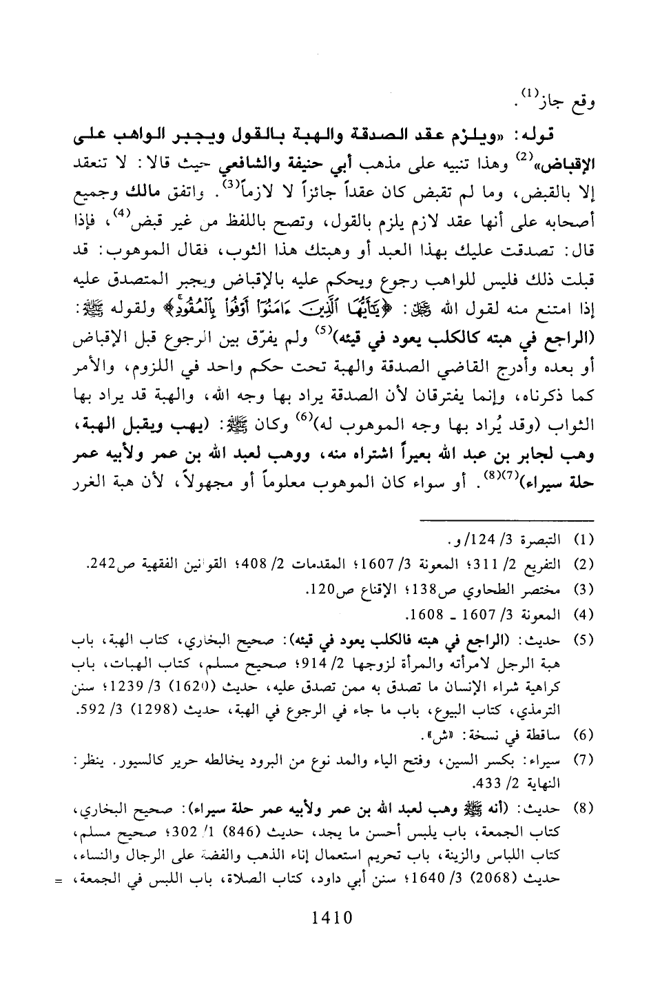 قوله: "ويلزم عقد الصدقة والهبة بالقول ويجبر الواهب على الإقباض" وهذا تنبيه على مذهب أبي حنيفة والشافعي حيث قالا: لا تنعقد إلا بالقبض، وما لم تقبض كان عقدًا جائزًا لا لازمًا. واتفق مالك وجميع أصحابه على أنها عقد لازم يلزم بالقول، وتصح باللفظ من غير قبض، فإذا قال: تصدقت عليك بهذا العبد أو وهبتك هذا الثوب، فقال الموهوب: قد قبلت ذلك فليس للواهب رجوع ويحكم عليه بالإقباض ويجبر المتصدق عليه إذا امتنع منه لقول الله -عز وجل-: {يأيها الذين آمنوا أوفوا بالعقود} ولقوله -صلى الله عليه وسلم-: (الراجع في هبته كالكلب يعود في قيئه) ولم يفرق بين الرجوع قبل الإقباض أو بعده وأدرج القاضي الصدقة والهبة تحت حكم واحد في اللزوم، والأمر كما ذكرناه، وإنما يفترقان لأن الصدقة يراد بها وجه الله، والهبة قد يراد بها الثواب (وقد يراد بها وجه الموهوب له) وكان -صلى الله عليه وسلم-: (يهب ويقبل الهبة، وهب لجابر بن عبد الله بعيرًا اشتراه منه، ووهب لعبد الله بن عمر ولأبيه عمر حلة سيراء). أو سواء كان الموهوب معلومًا أو مجهولاً، لأن هبة الغرر