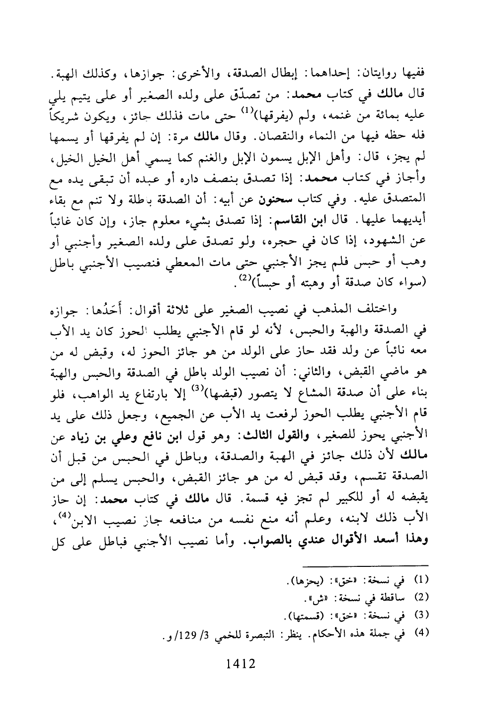 واختلف المذهب في نصيب الصغير على ثلاثة أقوال: أحدها: جوازه في الصدقة والهبة والحبس، لأنه لو قام الأجنبي يطلب الحوز كان يد الأب معه نائبًا عن ولده فقد حاز على الولد من هو جائز الحوز له، وقبض له من هو ماضي القبض، والثاني: أن نصيب الولد باطل في الصدقة والحبس والهبة بناء على أن صدقة المشاع لا يتصور (قبضها) إلا بارتفاع يد الواهب، فلو قام الأجنبي يطلب الحوز لرفعت يد الأب عن الجميع، وجعل ذلك على يد الأجنبي يحوز للصغير، والقول الثالث: وهو قول ابن نافع وعلي بن زياد عن مالك لأن ذلك جائز في الهبة والصدقة، وباطل في الحبس من قبل أن الصدقة تقسم، وقد قبض له من هو جائز القبض، والحبس يسلم إلى من يقبضه له أو للكبير لم تجز فيه قسمة. قال مالك في كتاب محمد: إن حاز الأب ذلك لابنه، وعلم أنه منع نفسه من منافعه جاز نصيب الابن، وهذا أسعد الأقوال عندي بالصواب، وأما نصيب الأجنبي فباطل على كل