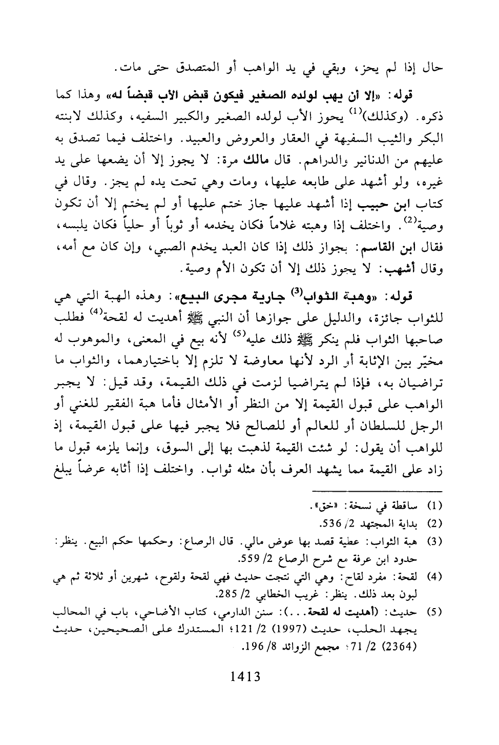 قوله: "إلا أن يهب لولده الصغير فيكون قبض الأب قبضًا له" وهذا كما ذكره. (وكذلك) يحوز الأب لولده الصغير والكبير السفيه، وكذلك لابنته البكر والثيب السفيهة في العقار والعروض والعبيد. واختلف فيما تصدق به عليهم من الدنانير والدراهم. قال مالك مرة: لا يجوز إلا أن يضعها على يد غيره، ولو أشهد على طابعه عليها، ومات وهي تحت يده لم يجز. وقال في كتاب ابن حبيب إذا أشهد عليها جاز ختم عليها أو لم يختم إلا أن تكون وصية. واختلف إذا وهبته غلامًا فكان يخدمه أو ثوبًا أو حليًا فكان يلبسه، فقال ابن القاسم: بجواز ذلك إذا كان العبد يخدم الصبي، وإن كان مع أمه، وقال أشهب: لا يجوز ذلك إلا أن تكون الأم وصية.