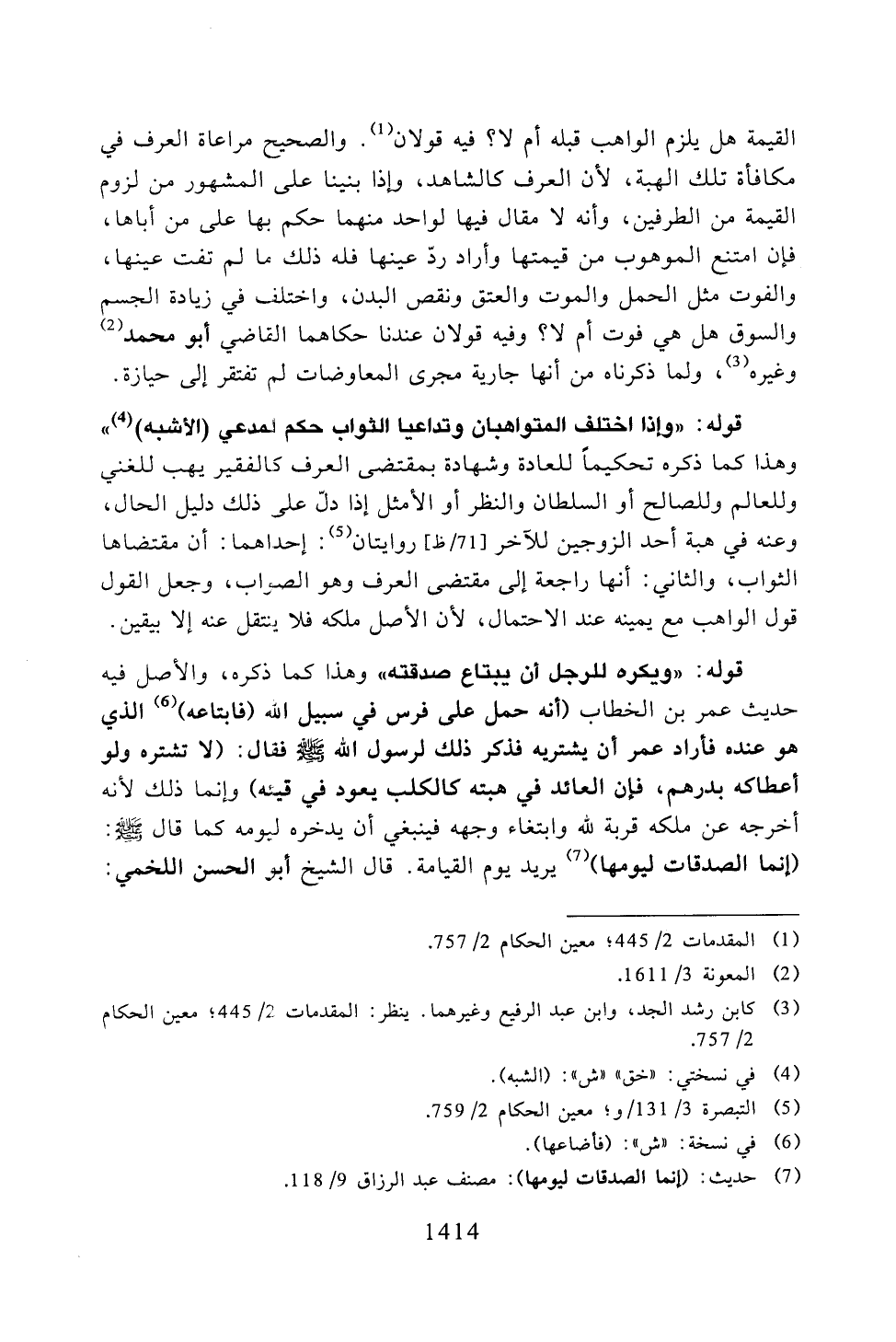 قوله: "وإذا اختلف المتواهبان وتداعيا الثواب حكم المدعي (الأشبه) " وهذا كما ذكره تحكيمًا للعادة وشهادة بمقتضى العرف كالفقير يهب للغني وللعالم وللصالح أو السلطان والنظر أو الأمثل إذا دل على ذلك دليل الحال، وعنه في هبة أحد الزوجين للآخر روايتان: إحداهما: أن مقتضاها الثواب، والثاني: أنها راجعة إلى مقتضى العرف وهو الصواب، وجعل القول قول الواهب مع يمينه عند الاحتمال، لأن الأصل ملكه فلا ينتقل عنه إلا بيقين.