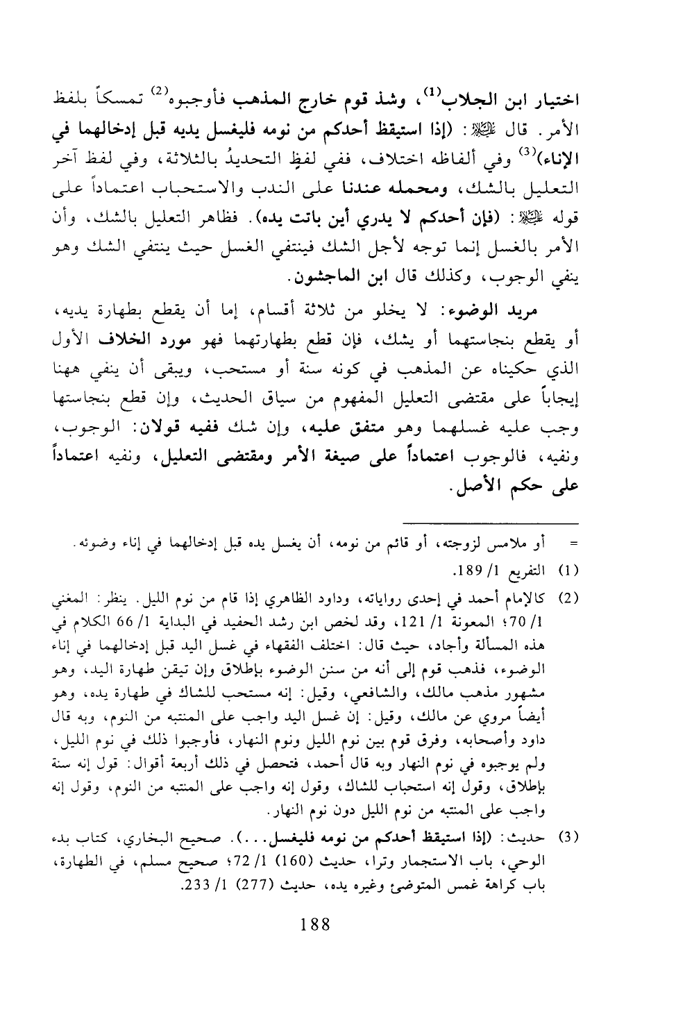 اختيار ابن الجلاب، وشذ قوم خارج المذهب فأوجبوه تمسكًا بلفظ الأمر. قال -عليه السلام -: (إذا استيقظ أحدكم من نومه فليغسل يديه قبل إدخالهما في الإناء) وفي ألفاظه اختلاف، ففي لفظ التحديد بالثلاثة، وفي لفظ آخر التعليل بالشك، ومحمله عندنا على الندب والاستحباب اعتمادًا على قوله -عليه السلام -: (فإن أحدكم لا يدري أين باتت يده). فظاهر التعليل بالشك، وأن الأمر بالغسل إنما توجه لأجل الشك فينتفي الغسل حيث ينتفي الشك وهو ينفي الوجوب، وكذلك قال ابن الماجشون.
