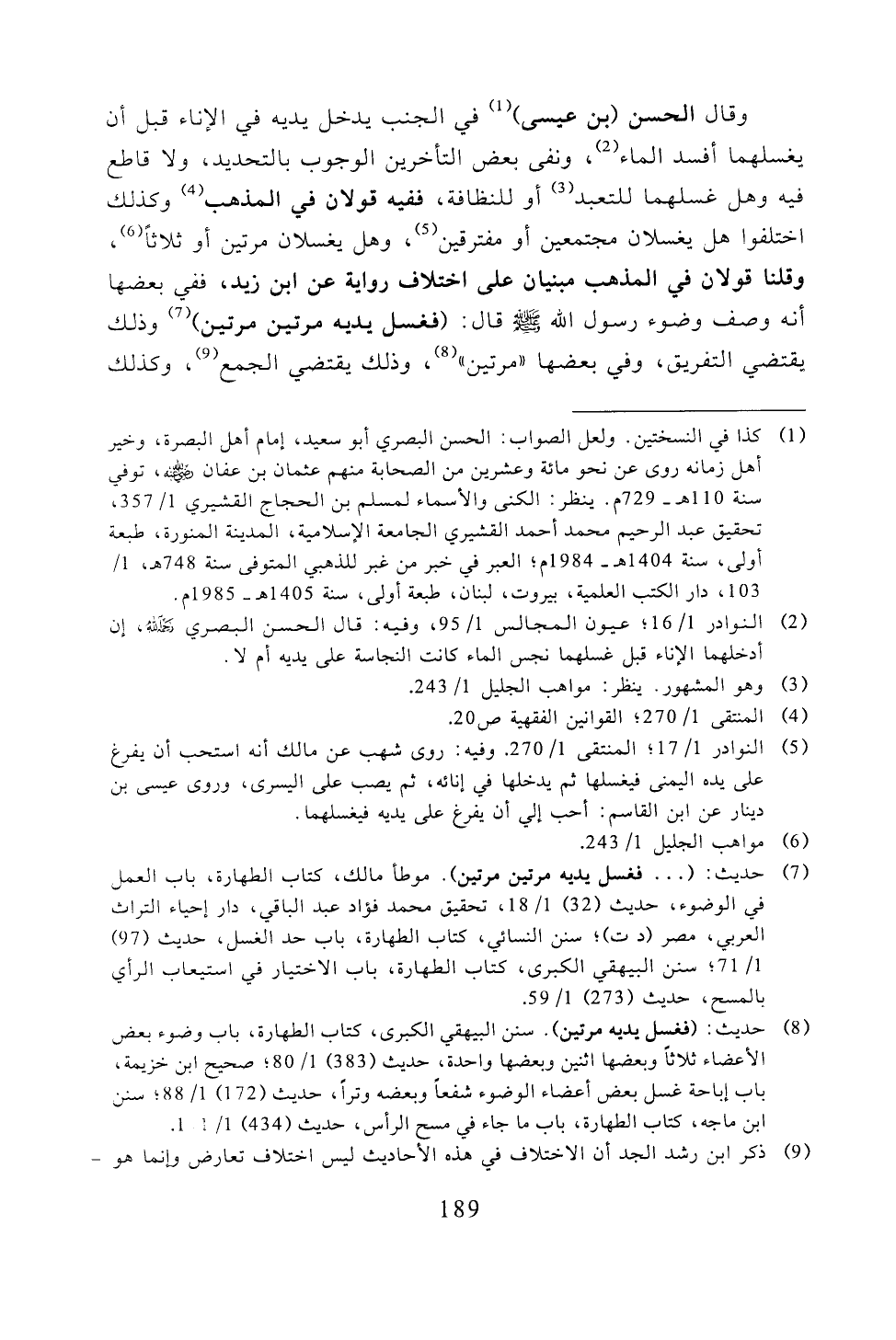 وقال الحسن (بن عيسى) في الجنب يدخل يديه في الإناء قبل أن يغسلهما أفسد الماء، ونفى بعض التأخرين الوجوب بالتحديد، ولا قاطع فيه وهل غسلهما للتعبد أو للنظافة، ففيه قولان في المذهب وكذلك اختلفوا هل يغسلان مجتمعين أو مفترقين، وهل يغسلان مرتين أو ثلاثًا، وقلنا قولان في المذهب مبنيان على اختلاف رواية عن ابن زيد، ففي بعضها أنه وصف وضوء رسول الله -صلى الله عليه وسلم -قال: (فغسل يديه مرتين مرتين) وذلك يقتضي التفريق، وفي بعضها "مرتين"، وذلك يقتضي الجمع، وكذلك