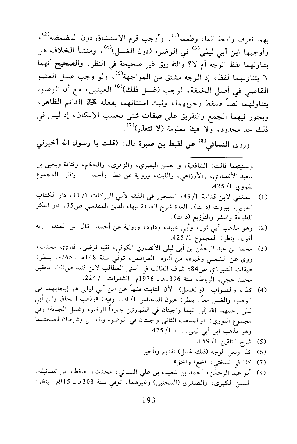 بهما تعرف رائحة الماء وطعمه. وأوجب قوم الاستنشاق دون المضمضة، وأوجبها ابن أبي ليلى في الوضوء (دون الغسل)، ومنشأ الخلاف هل يتناولهما لفظ الوجه أم لا؟ والتفاريق غير صحيحة في النظر، والصحيح أنهما لا يتناولهما لفظ، إذ الوجه مشتق من المواجهة، ولو وجب غسل العضو القاصي في أصل الخلقة، لوجب (غسل ذلك) العينين، مع أن الوضوء يتناولهما نصًا فسقط وجوبهما، وثبت استنانهما بفعله -عليه السلام -الدائم الظاهر، ويجوز فيهما الجمع والتفريق على صفات شتى بحسب الإمكان، إذ ليس في ذلك حد محدود، ولا هيئة معلومة (لا تتعذر).