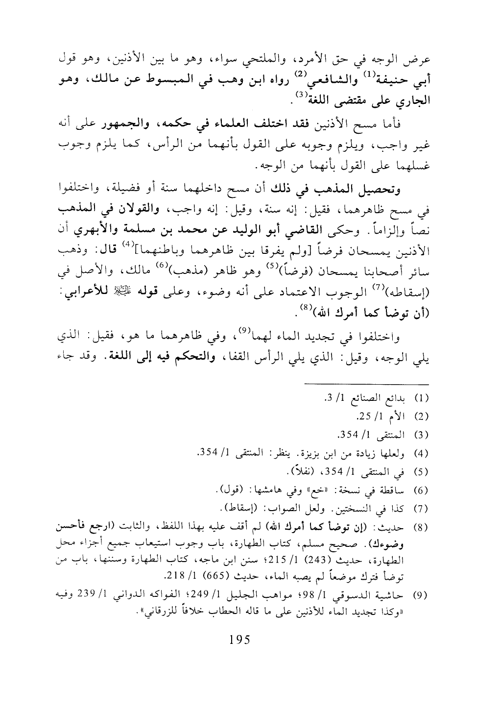 وتحصيل المذهب في ذلك أن مسح داخلهما سنة أو فضيلة، واختلفوا في مسح ظاهرهما، فقيل: إنه سنة، وقيل: إنه واجب، والقولان في المذهب نصًا وإلزامًا. وحكى القاضي أبو الوليد عن محمد بن مسلمة والأبهري أن الأذنين يمسحان فرضًا [ولم يفرقا بين ظاهرهما وباطنهما] قال: وذهب سائر أصحابنا يمسحان (فرضًا) وهو ظاهر (مذهب) مالك، والأصل في (إسقاطه) الوجوب الاعتماد على أنه وضوء، وعلى قوله -عليه السلام -للأعرابي: (أن توضأ كما أمرك الله).