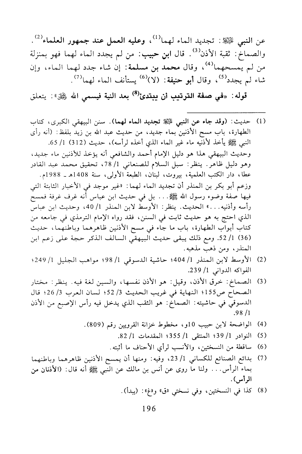 والصماخ: ثقبة الأذن. قال ابن حبيب: من لم يجدد الماء لهما فهو بمنزلة من لم يمسحهما، وقال محمد بن مسلمة: إن شاء جدد لهما الماء، وإن شاء لم يجدد، وقال أبو حنيفة: (لا) يستأنف الماء لهما.