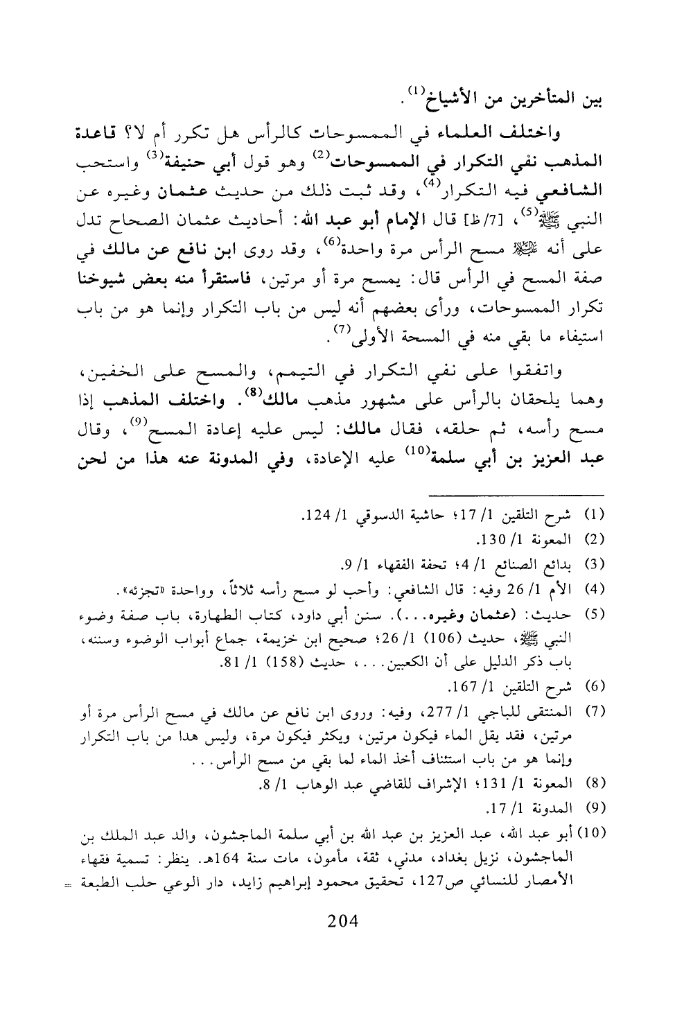 واختلف العلماء في الممسوحات كالرأس هل تكرر أم لا؟ قاعدة المذهب نفي التكرار في الممسوحات وهو قول أبي حنيفة واستحب الشافعي فيه التكرار، وقد ثبت ذلك من حديث عثمان وغيره عن النبي -صلى الله عليه وسلم -، قال الإمام أبو عبد الله: أحاديث عثمان الصحاح تدل على أنه -عليه السلام -، مسح الرأس مرة واحدة، وقد روى ابن نافع عن مالك في صفة المسح في الرأس قال: يمسح مرة أو مرتين، فاستقرأ منه بعض شيوخنا تكرار الممسوحات، ورأى بعضهم أنه ليس من باب التكرار وإنما هو من باب استيفاء ما بقي منه في المسحة الأولى.