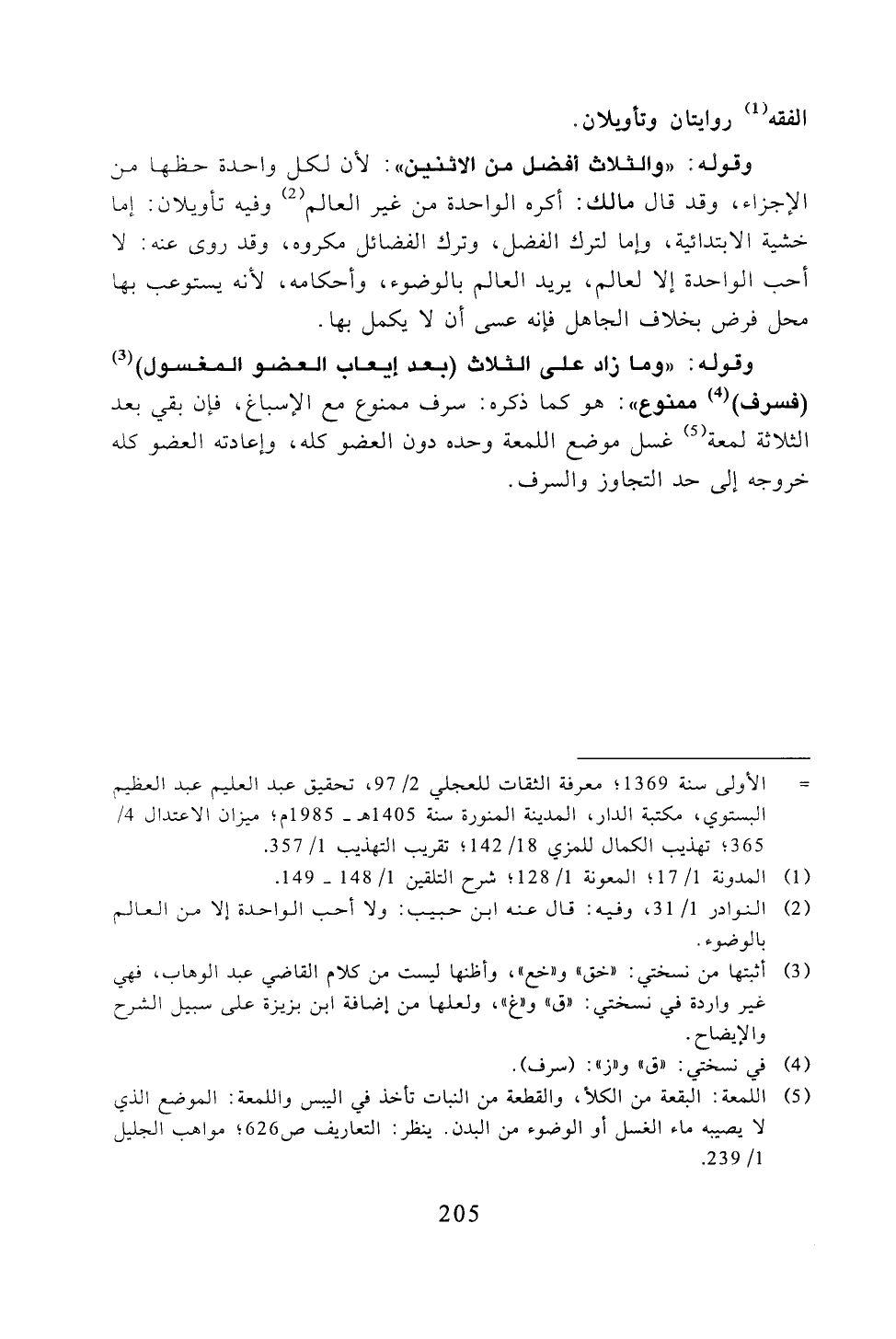 وقوله: "والثلاث أفضل من الاثنين": لأن لكل واحدة حظها من الإجزاء، وقد قال مالك: أكره الواحدة من غير العالم وفيه تأويلان: إما خشية الابتدائية، وإما لترك الفضل، وترك الفضائل مكروه، وقد روى عنه: لا أحب الواحدة إلا لعالم، يريد العالم بالوضوء، وأحكامه، لأنه يستوعب بها محل فرض بخلاف الجاهل فإنه عسى أن لا يكمل بها.