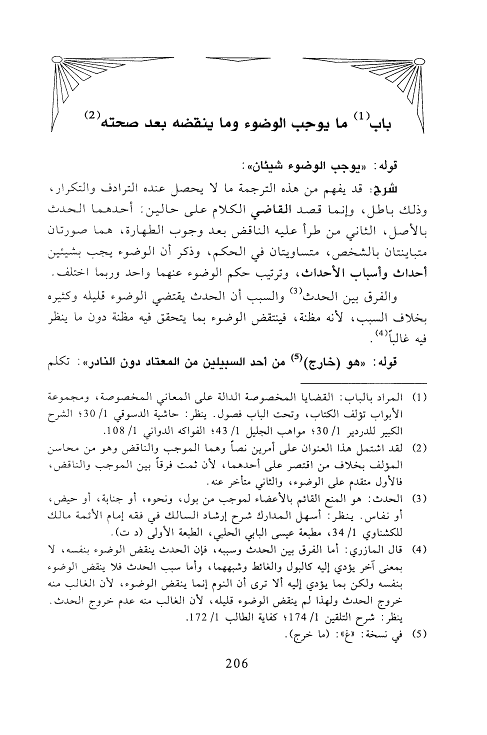 شرح: قد يفهم من هذه الترجمة ما لا يحصل عنده الترادف والتكرار، وذلك باطل، وإنما قصد القاضي الكلام على حالين: أحدهما الحدث بالأصل، الثاني من طرأ عليه الناقض بعد وجوب الطهارة، هما صورتان متباينتان بالشخص، متساويتان في الحكم، وذكر أن الوضوء يجب بشيئين أحداث وأسباب الأحداث، وترتيب حكم الوضوء عنهما واحد وربما اختلف.