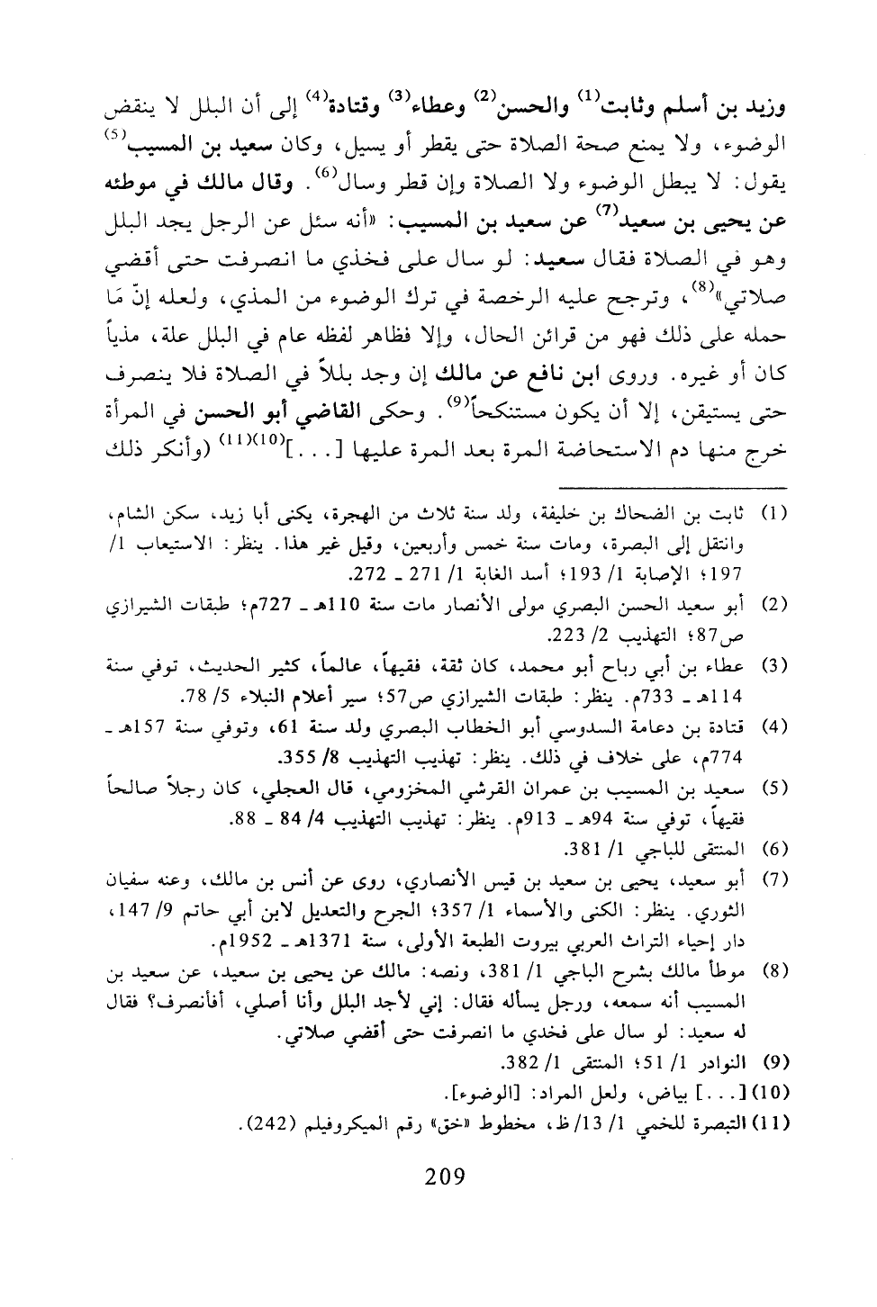 وزيد بن أسلم وثابت والحسن وعطاء وقتادة إلى أن البلل لا ينقض الوضوء، ولا يمنع صحة الصلاة حتى يقطر أو يسيل، وكان سعيد بن المسيب يقول: لا يبطل الوضوء ولا الصلاة وإن قطر وسال. وقال مالك في موطئه عن يحيى بن سعيد عن سعيد بن المسيب: "أنه سئل عن الرجل يجد البلل وهو في الصلاة فقال سعيد: لو سال على فخذي ما انصرفت حتى أقضي صلاتي"، وترجح عليه الرخصة في ترك الوضوء من المذي، ولعله إن ما حمله على ذلك فهو من قرائن الحال، وإلا فظاهر لفظه عام في البلل علة، مذيًا كان أو غيره. وروى ابن نافع عن مالك إن وجد بللاً في الصلاة فلا ينصرف حتى يستيقن، إلا أن يكون مستنكحًا. وحكى القاضي أبو الحسن في المرأة خرج منها دم الاستحاضة المرة بعد المرة عليها [ ... ] (وأنكر ذلك