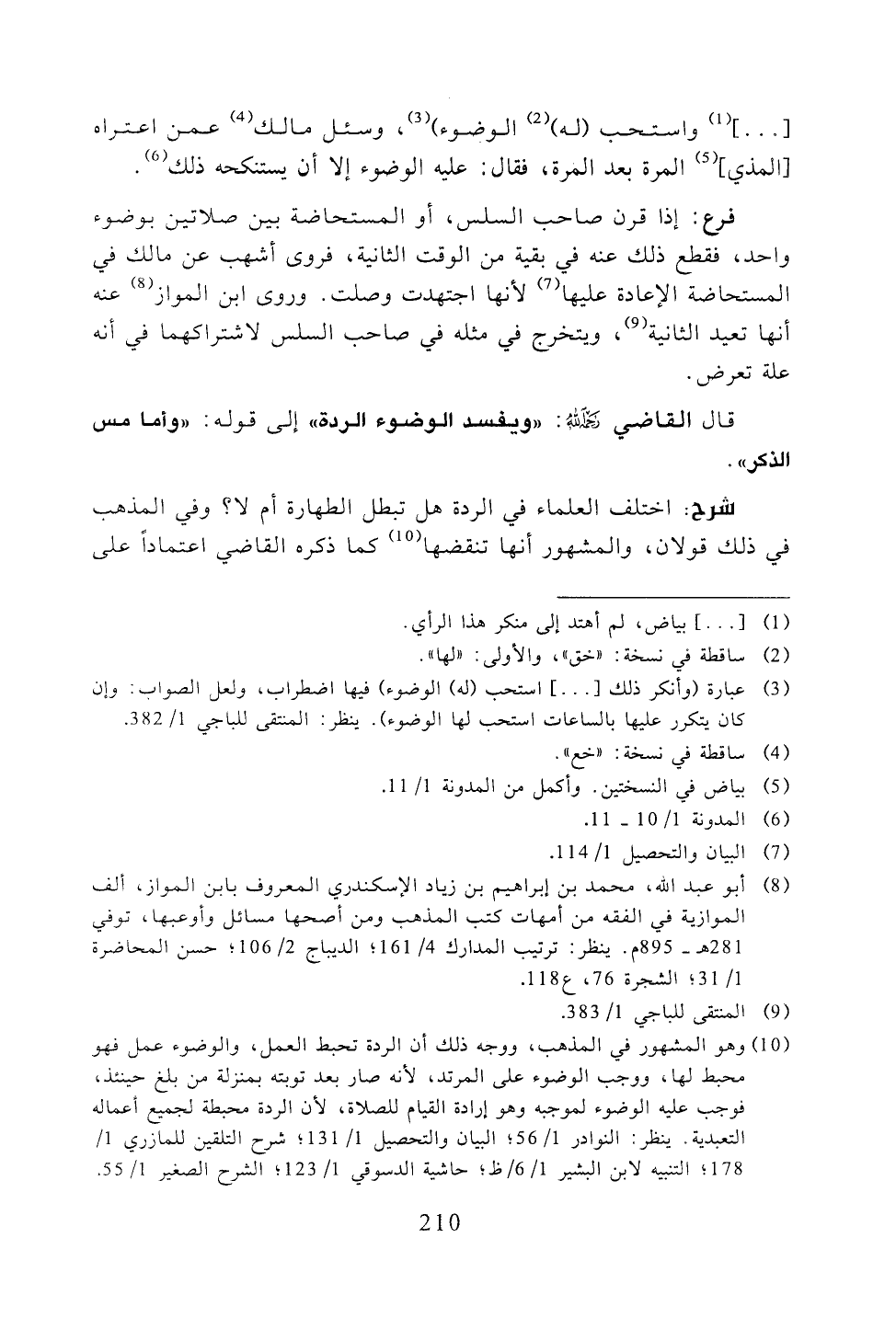 [ ... ] واستحب (له) الوضوء)، وسئل مالك عمن اعتراه [المذي] المرة بعد المرة، فقال: عليه الوضوء إلا أن يستنكحه ذلك.