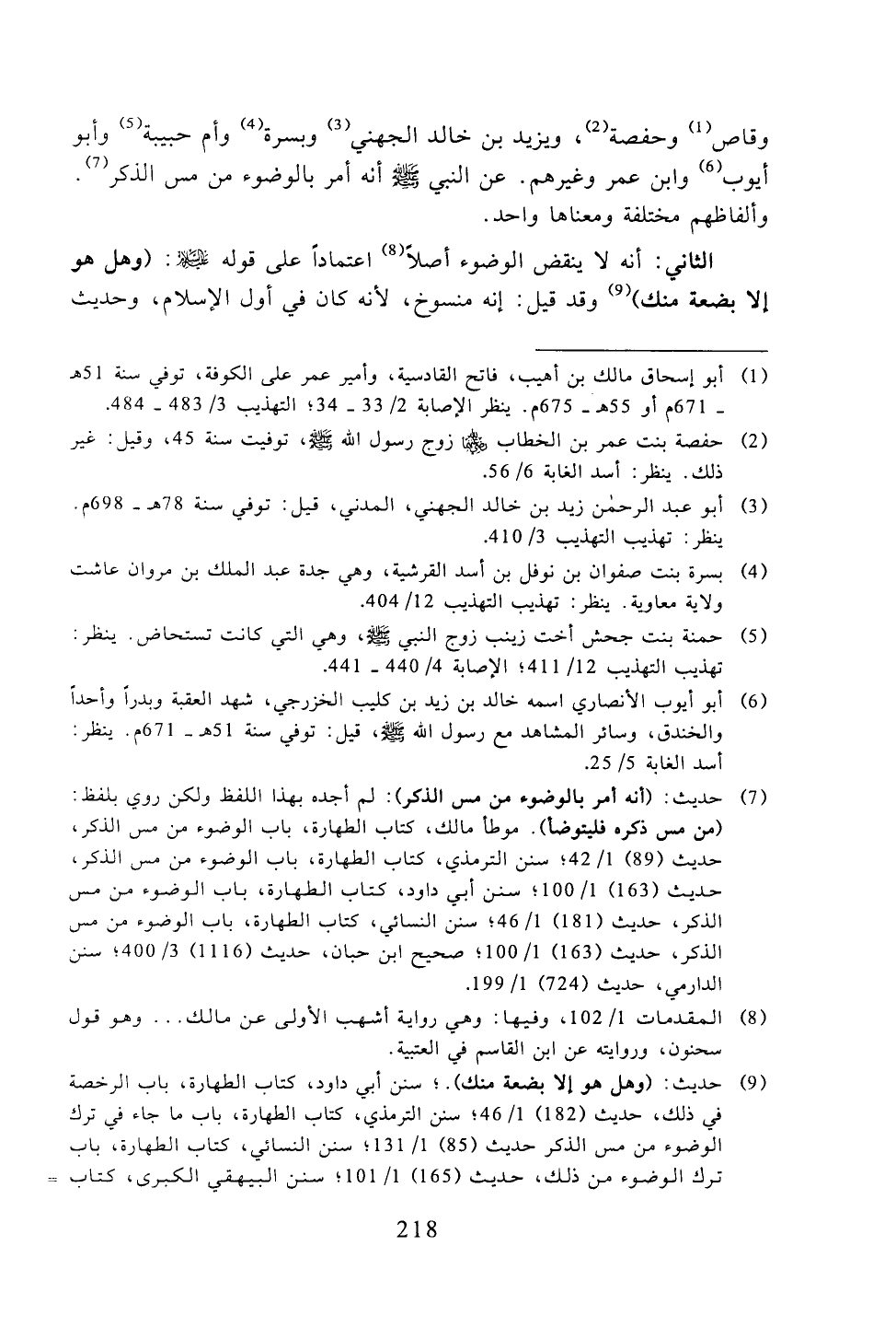 وقاص وحفصة، ويزيد بن خالد الجهني وبسرة وأم حبيبة وأبو أيوب وابن عمر وغيرهم. عن النبي -صلى الله عليه وسلم -أنه أمر بالوضوء من مس الذكر. وألفاظهم مختلفة ومعناها واحد.