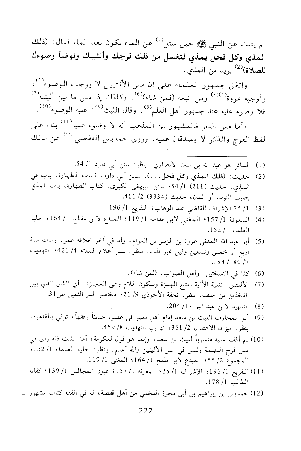 واتفق جمهور العلماء على أن مس الأنثيين لا يوجب الوضوء، وأوجبه عروة ومن اتبعه (فمن شاء)، وكذلك إذا مس ما بين أليتيه فلا وضوء عليه عند جمهور أهل العلم. وقال الليث: عليه الوضوء.