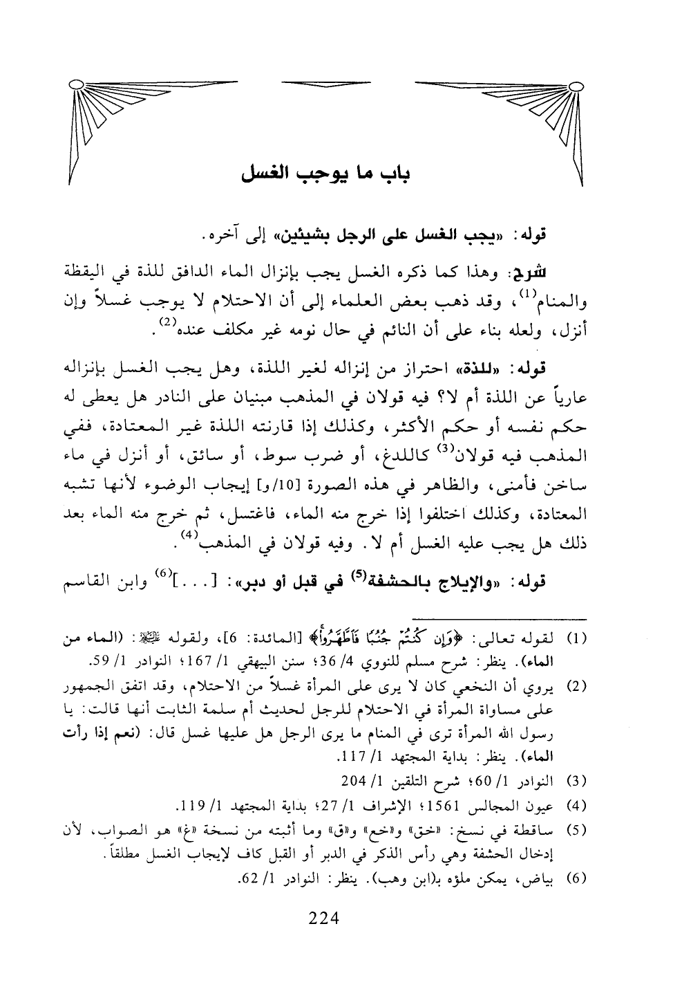قوله: "للذة" احتراز من إنزاله لغير اللذة، وهل يجب الغسل بإنزاله عاريًا عن اللذة أم لا؟ فيه قولان في المذهب مبنيان على النادر هل يعطى له حكم نفسه أو حكم الأكثر، وكذلك إذا قارنته اللذة غير المعتادة، ففي المذهب فيه قولان كاللدغ، أو ضرب سوط، أو سائق، أو أنزل في ماء ساخن فأمنى، والظاهر في هذه الصورة إيجاب الوضوء لأنها تشبه المعتادة، وكذلك اختلفوا إذا خرج منه الماء، فاغتسل، ثم خرج منه الماء بعد ذلك هل يجب عليه الغسل أم لا. وفيه قولان في المذهب.