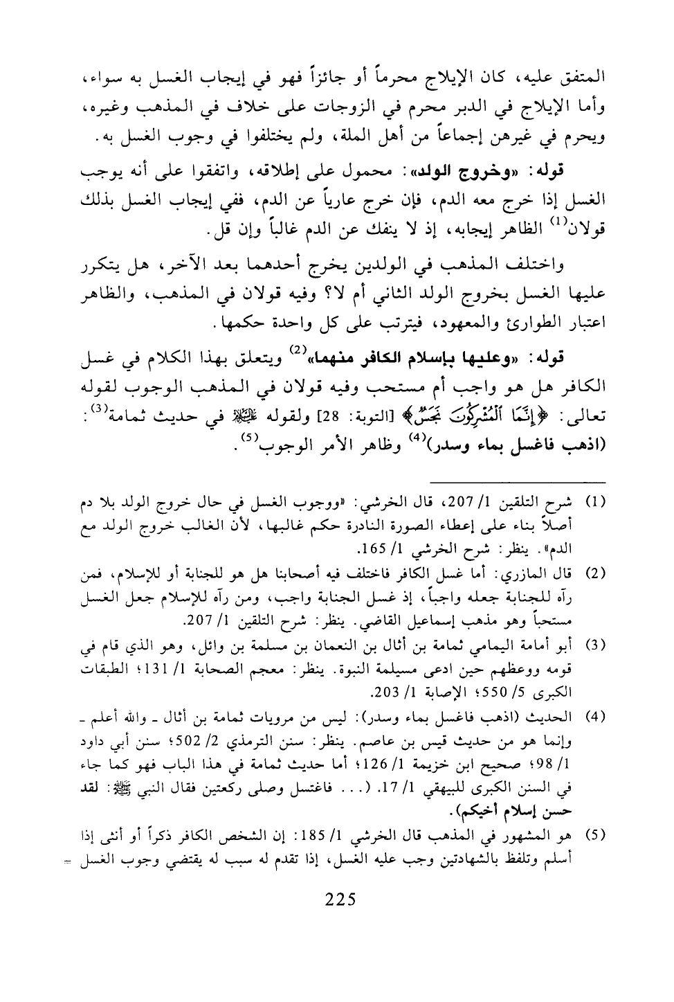 قوله: "وعليها بإسلام الكافر منهما" ويتعلق بهذا الكلام في غسل الكافر هل هو واجب أم مستحب وفيه قولان في المذهب الوجوب لقوله تعالى: {إنما المشركون نجس} [التوبة: 28] ولقوله -عليه السلام -في حديث ثمامة: (اذهب فاغسل بماء وسدر) وظاهر الأمر الوجوب.
